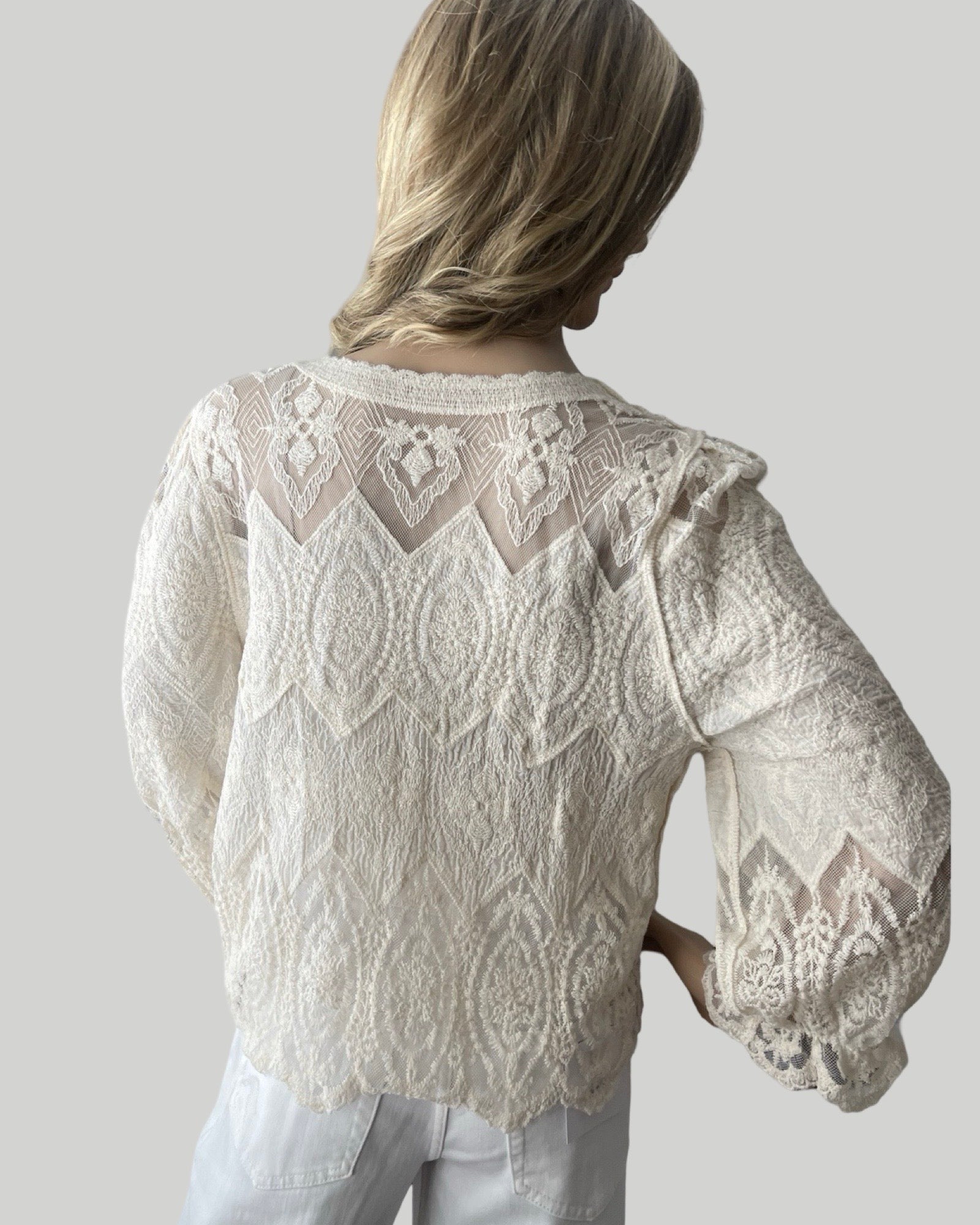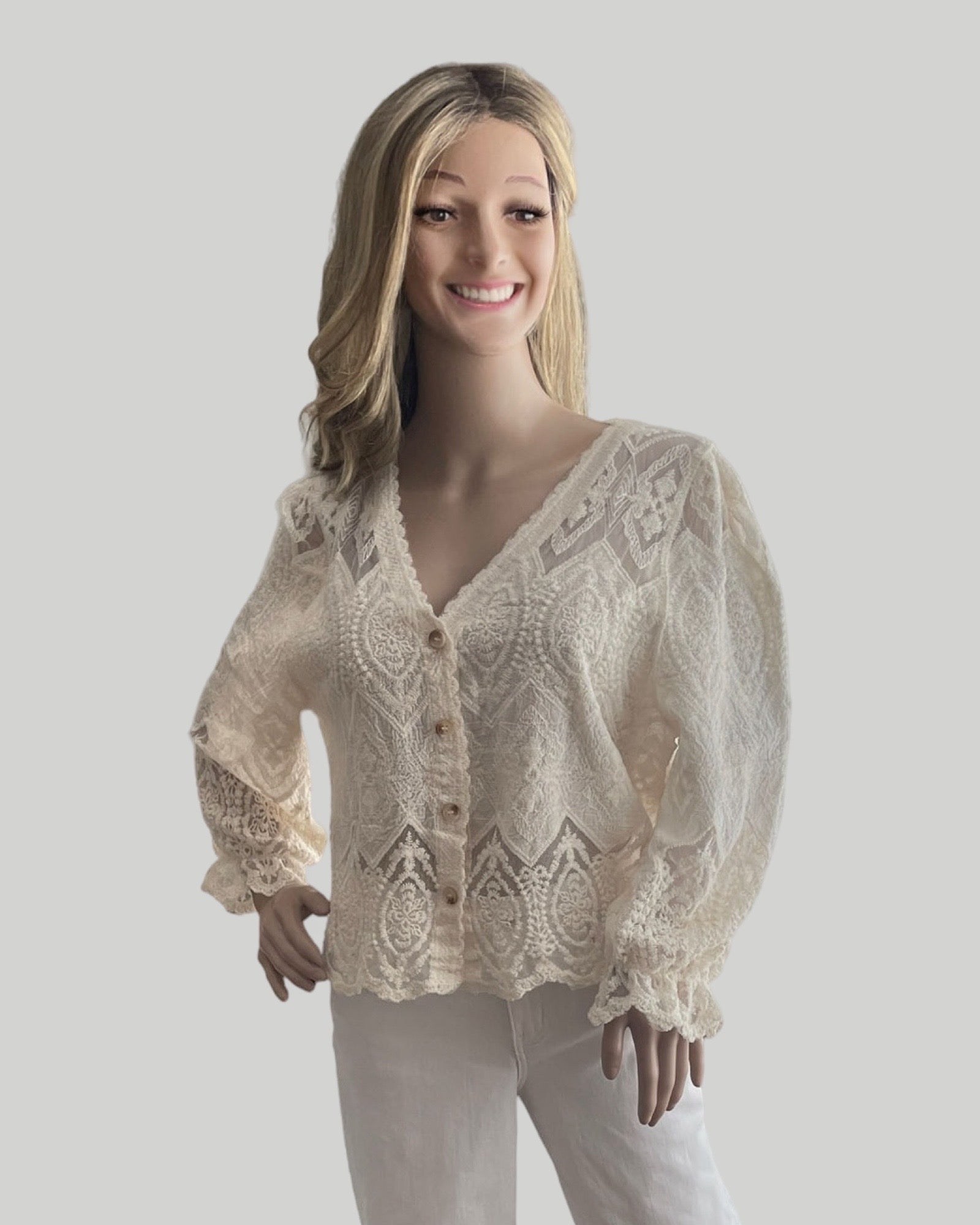 BEIGE LACE BUTTON FRONT LONG SLEEVE TOP, SEMI SHEER