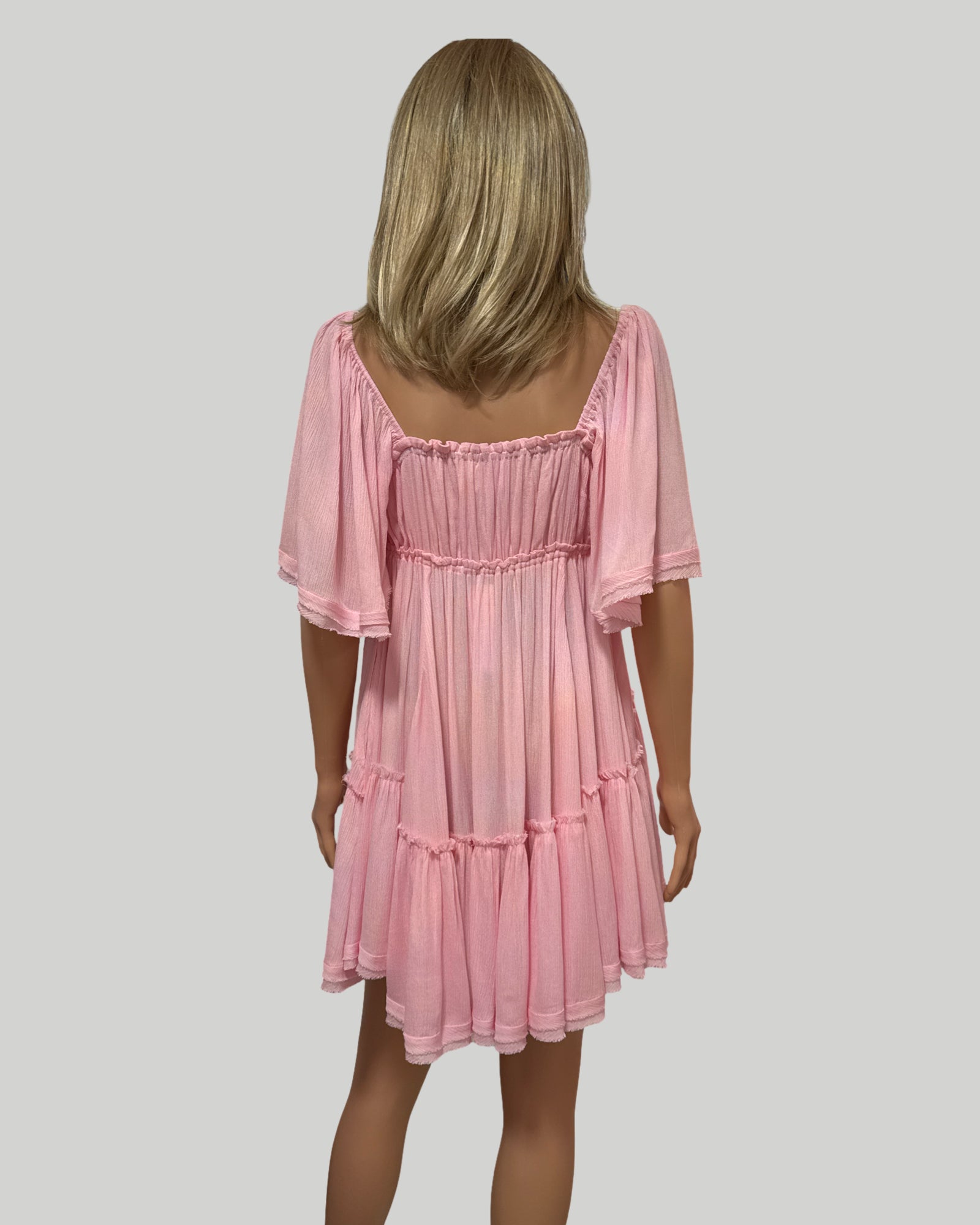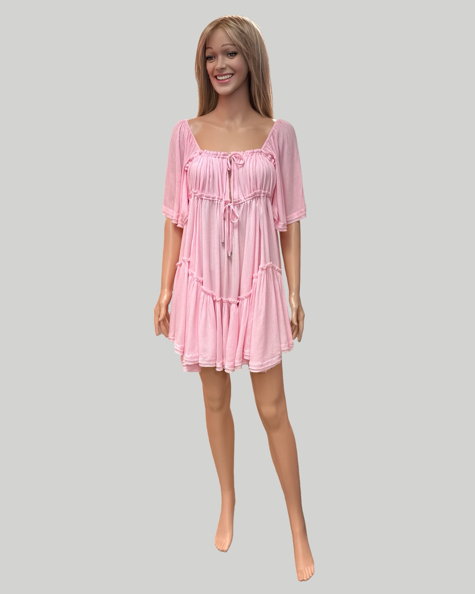 Ruffle hem ruched mini dress light pink. Adorable Baby Doll Dress. Gathered Tie Neckline and Under the Bust Line. Ruffle Hem with Side Pockets. Fun and Flirty.