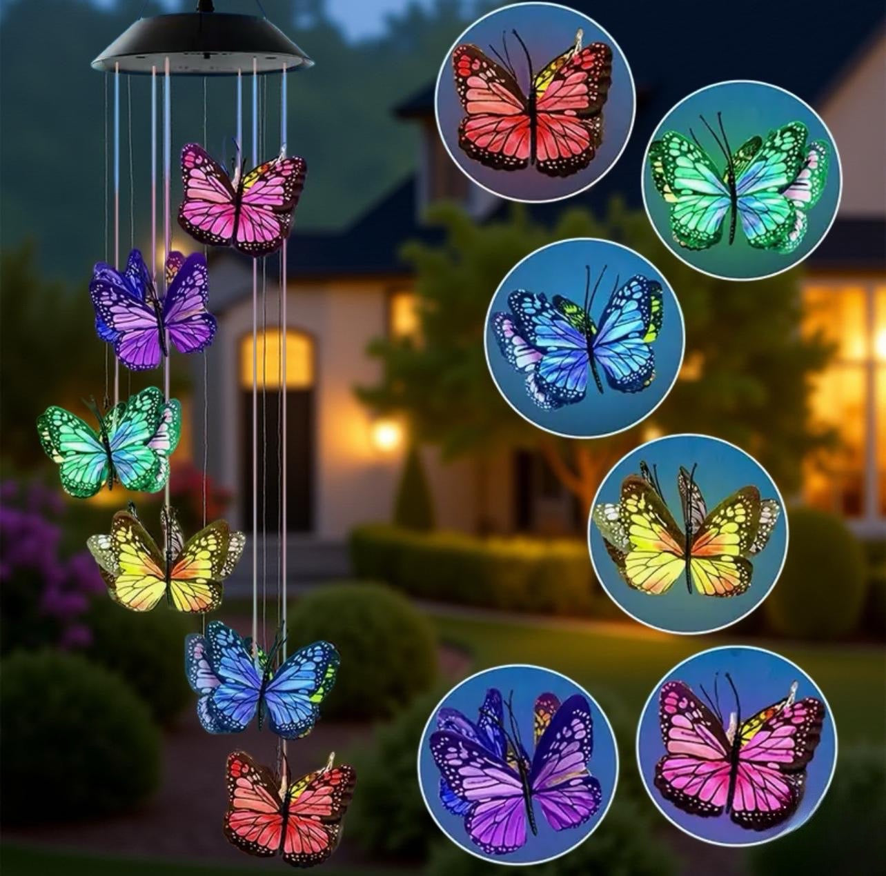 BUTTERFLY SOLAR WIND CHIME MULTI COLOR. IP65 Waterproof, On/Off Switch. With 6-8 Hours of Sunlight Charging, These Beautiful Butterflies will Light at Night for 8-12 Hours, Changing Colors. Beautiful Gift to Give or to Keep for Yourself.