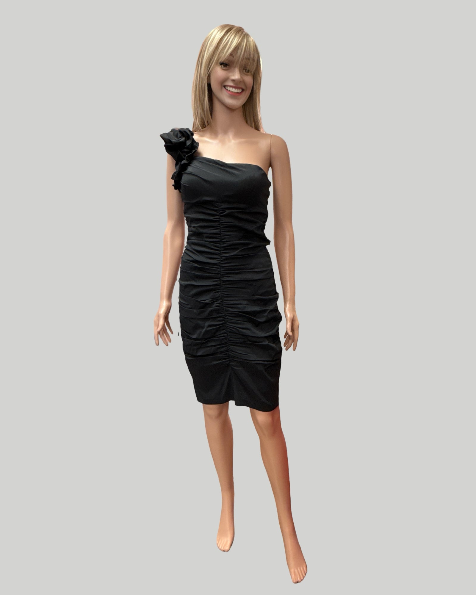 Cache ruffled one shoulder black gathered dress. Flattering gathers add appeal to any figure. One shoulder adorned with a ruffle.