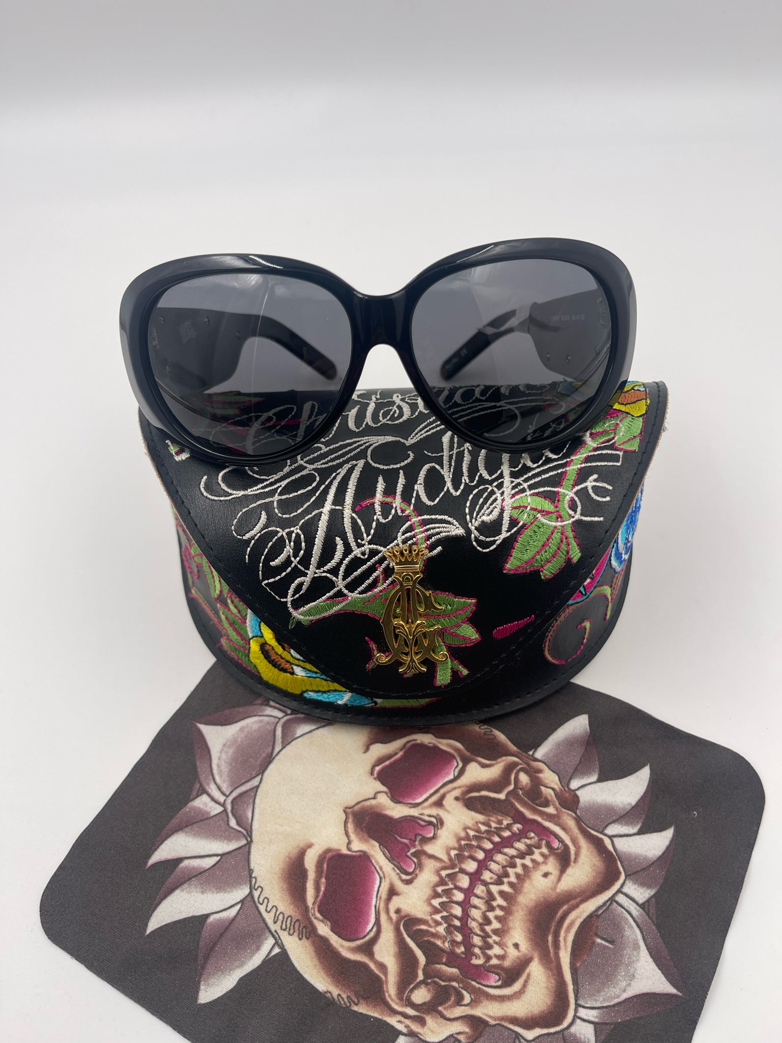 CHRISTIAN AUDIGIER AUTHENTIC SUNGLASSES. "BROKEN HEARTS" BLACK WITH RED AND GREEN AUSTRIAN CRYSTALS FROM THE HOUSE OF DANIEL SWAROVSKI. UV 400 PROTECTION.CAS410