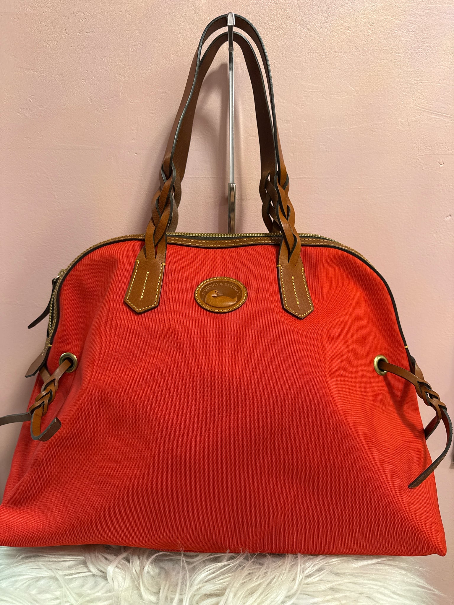 Dooney and Bourke large red domed satchel, braided handles. Canvas with leather handles. Beautiful color.