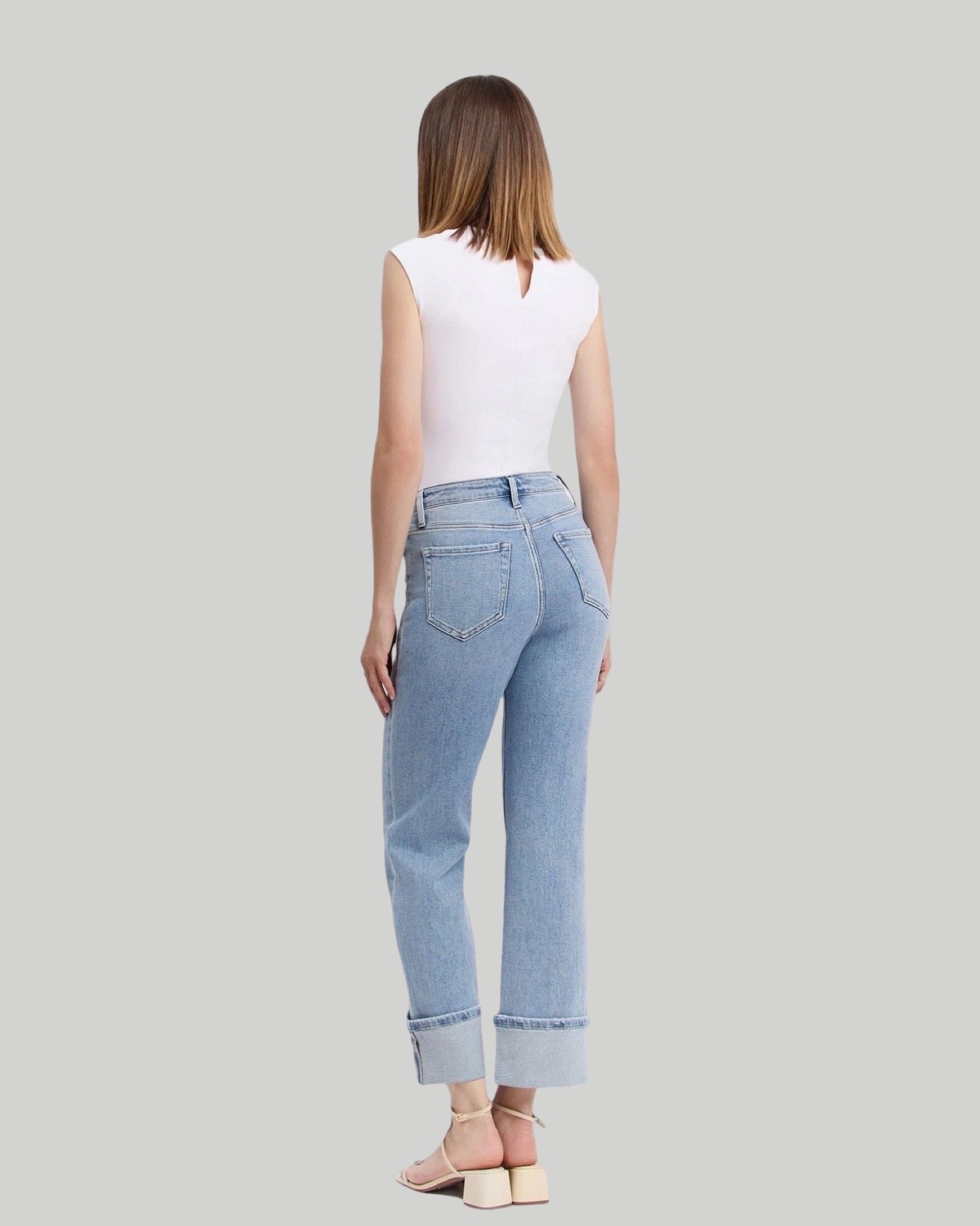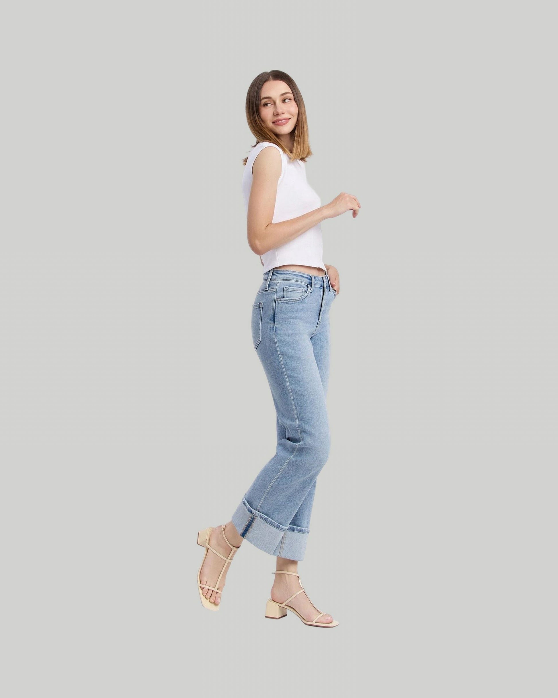 High rise cuffed slim wide jeans. Comfort stretch, high waist, single cuff hem, ankle length. rise: 10 1/4"/inseam: 28"/leg opening: 18"/cuff: 4"X 1 93% cotton, 5% polyester, 2% spandex We suggest sizing down one size