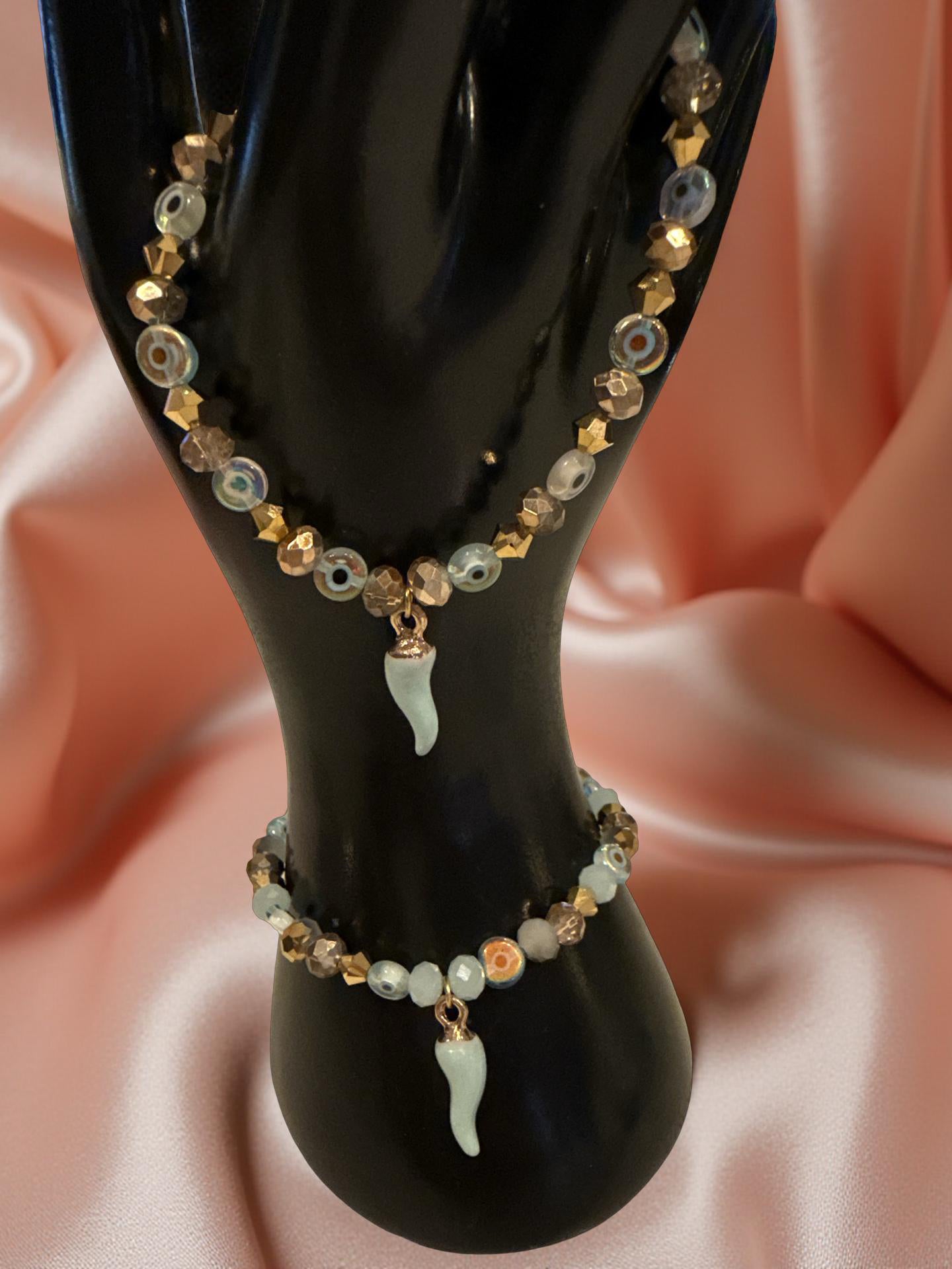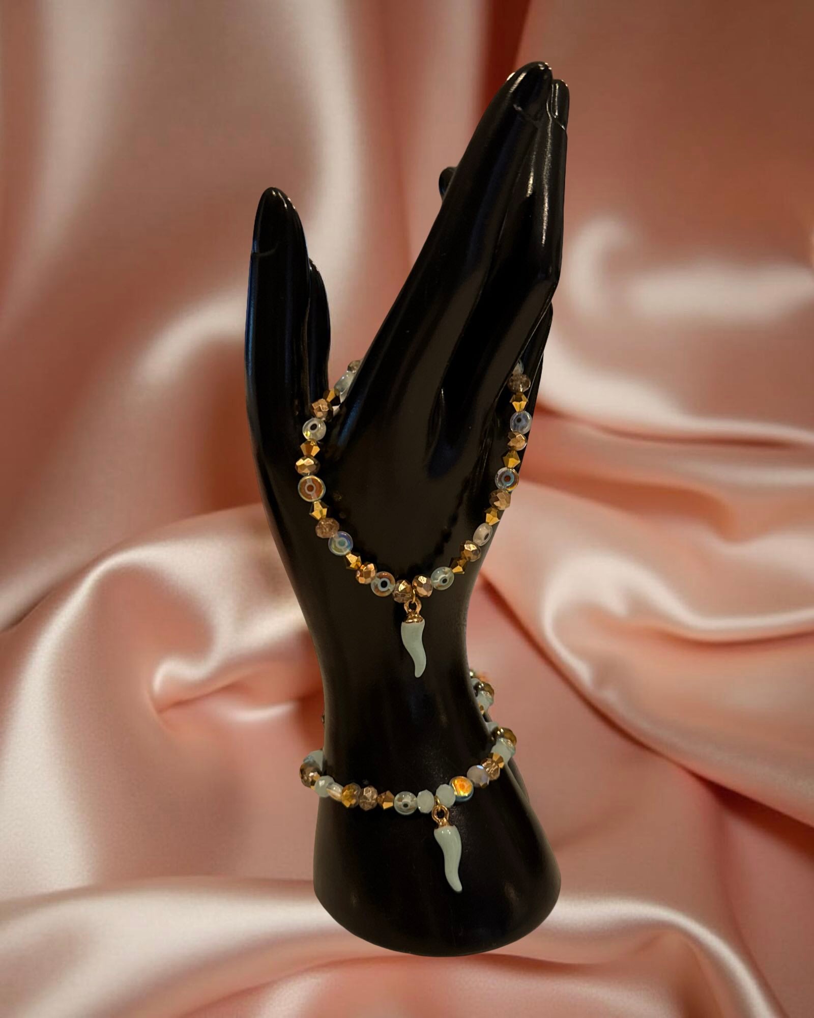 EVIL EYE AND BLUE HORN SURROUNDED BY HANDMADE BEADS BRACELET