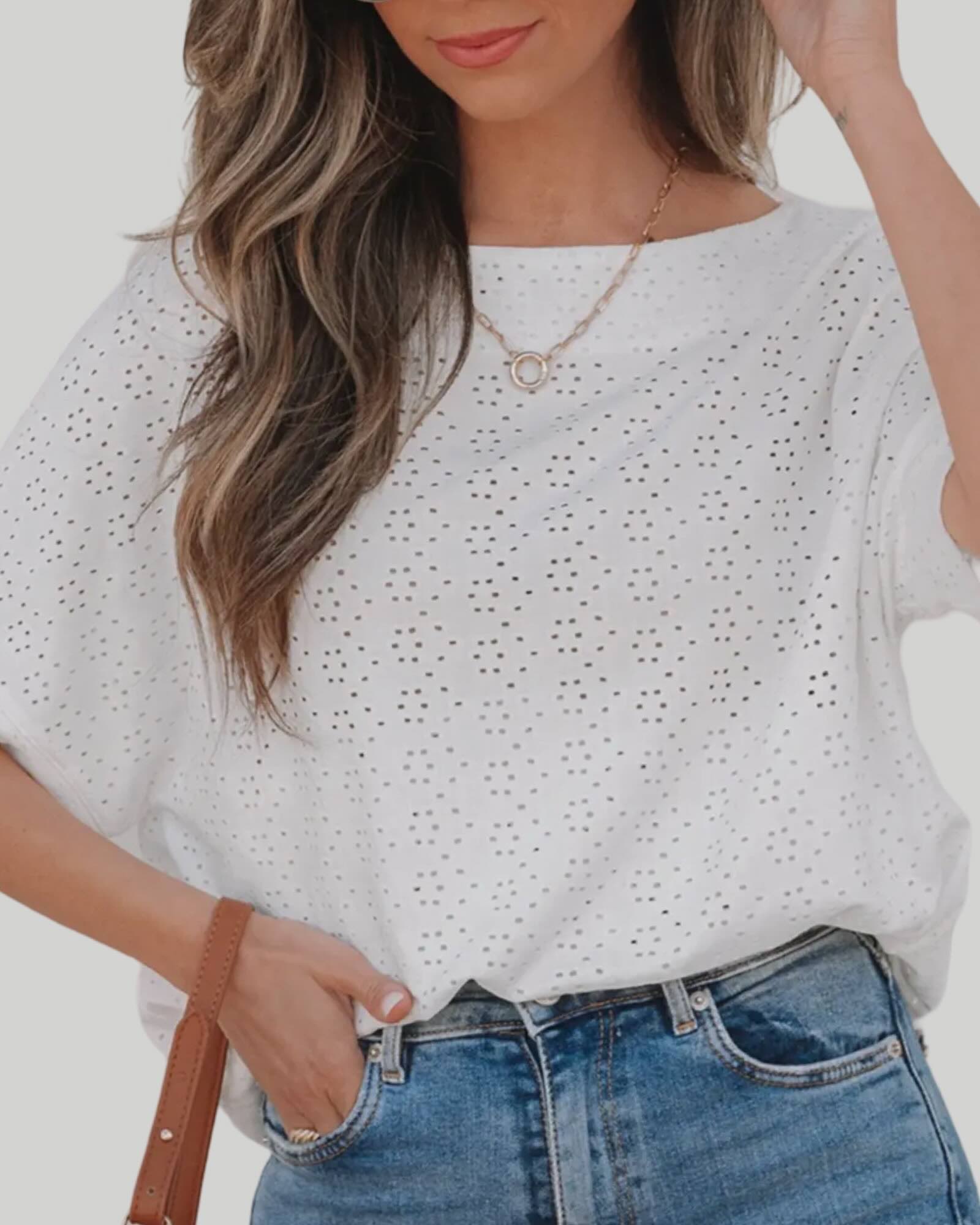 EYELET PATTERN BOAT NECK CASUAL TEE. Elevate your wardrobe with this chic, meticulously designed piece that seamlessly blends style and comfort, allowing you to showcase your unique charm on any occasion. Material: 97%Polyester/3% Elastane