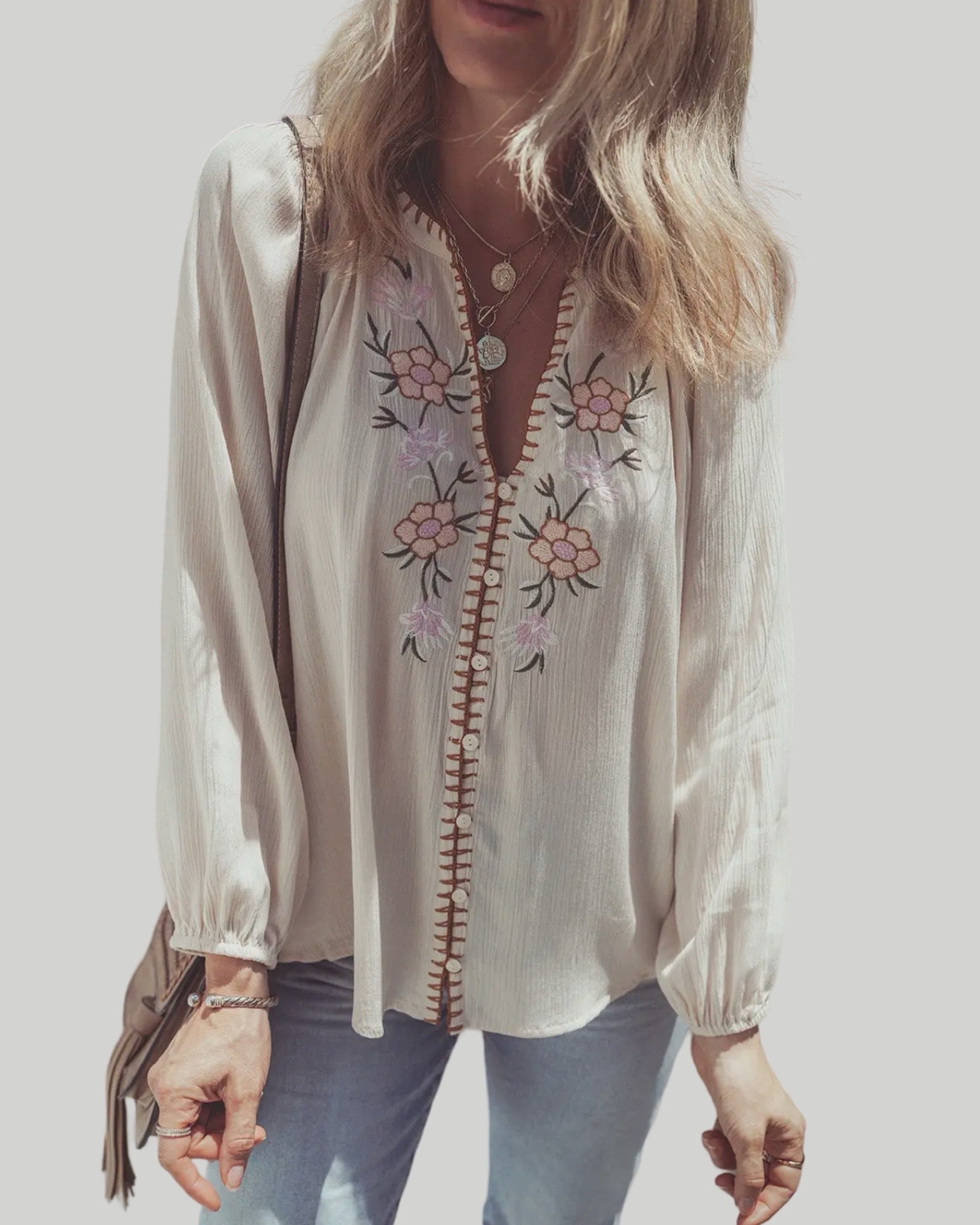 FLORAL EMBROIDERED TEXTURED PUFF LONG SLEEVE LOOSE TOP. Beige Top with Embroidered Detail on Front. Loos fit, V-Neck,Button Front. Fabulous with Denim or Linen Pants. 100% Viscose