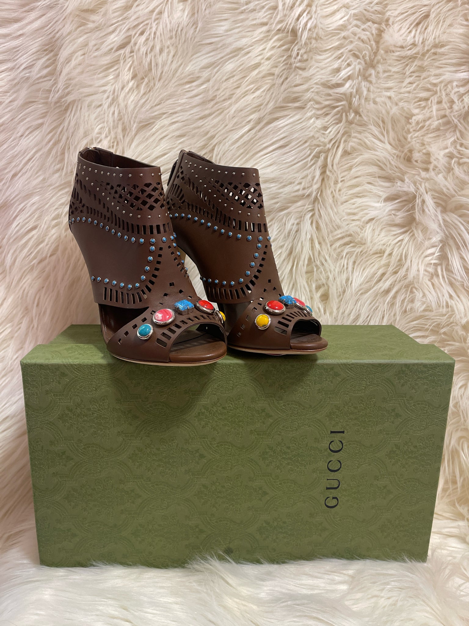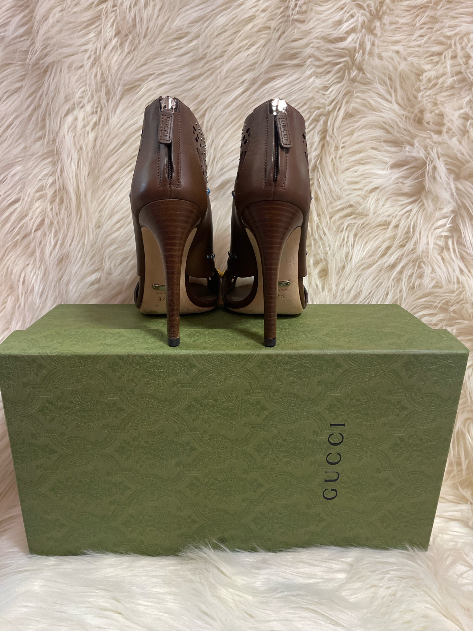 GUCCI LIKA LASER NUT BROWN PEEP TOE BOOTIE 37 1/2