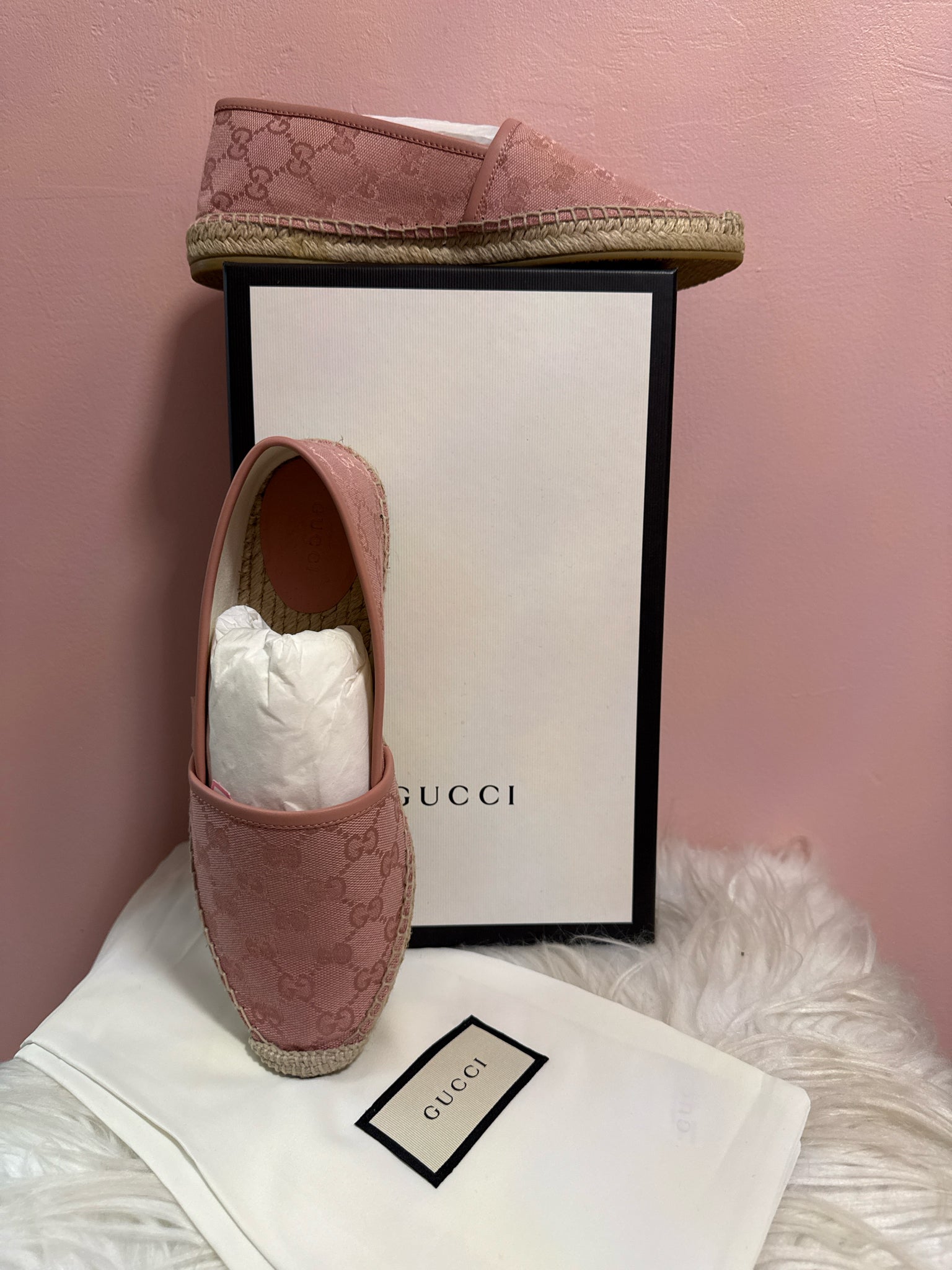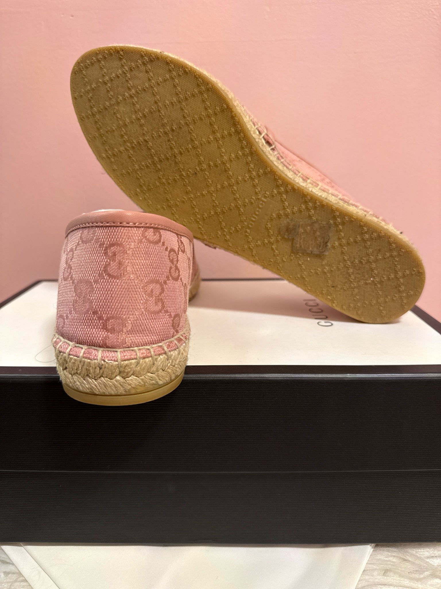 Gucci pink espadrilles with box and dust bag. Canvas fabric in Excellent Condition. So Cute!