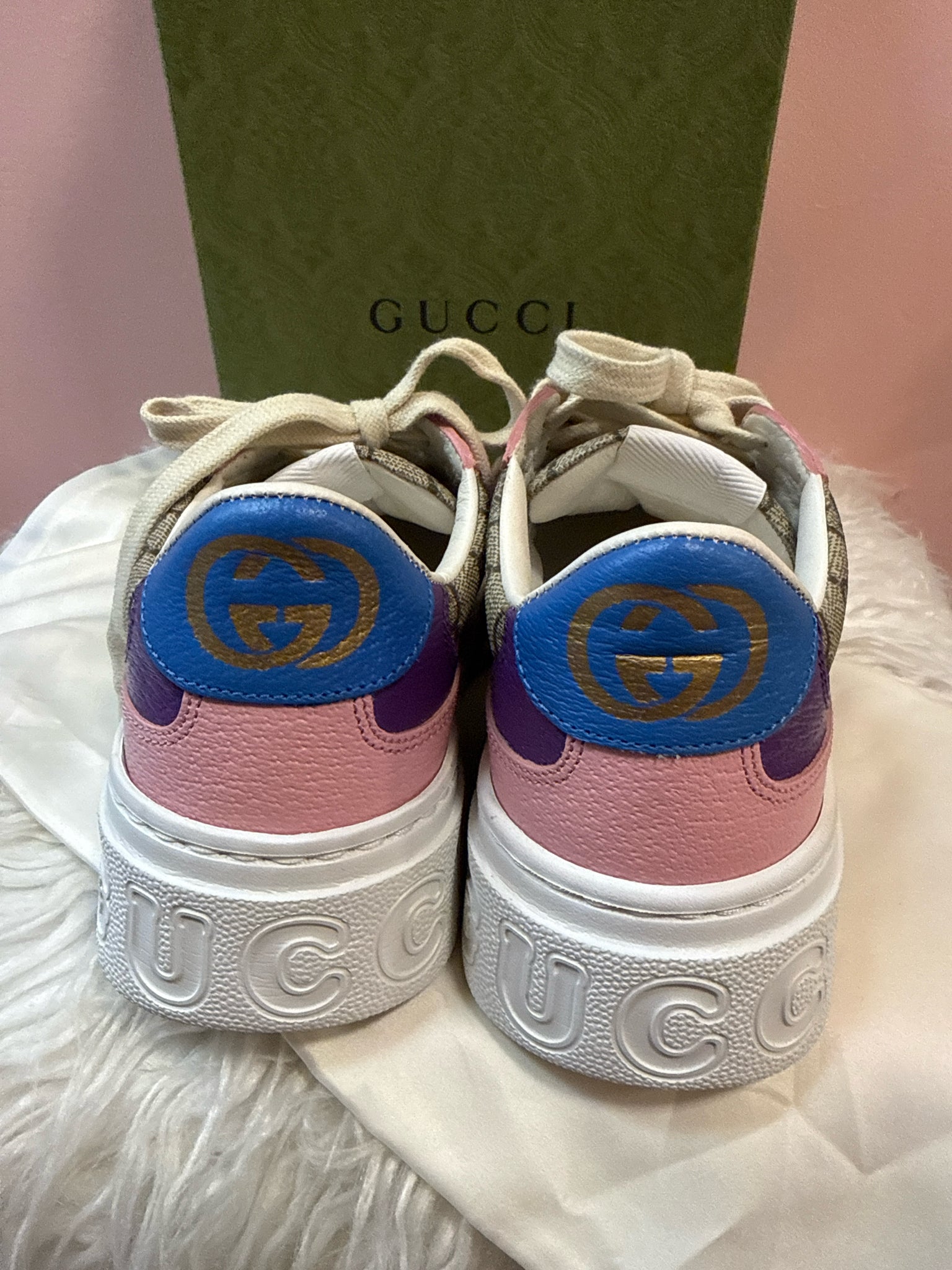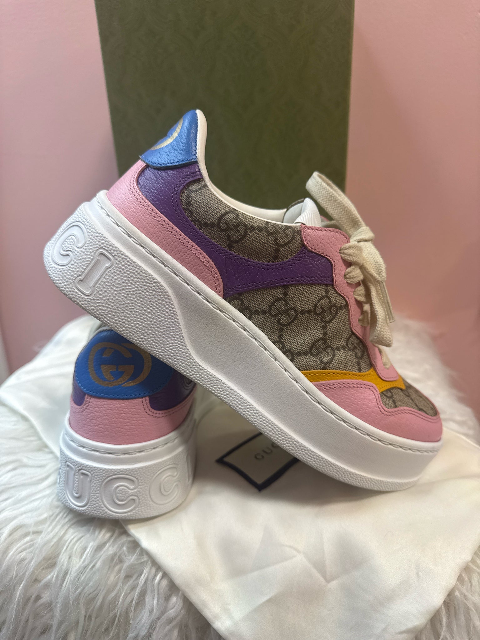 So adorable! Authentic GG Supreme & Interlocking G Logo. Leather & Rubber Trim, Round-Toes, Platform, Lace-Up Closure at Uppers Includes Box, Dust Bag & Additional Laces. Monogram, Pink, mustard, purple and white. 726850