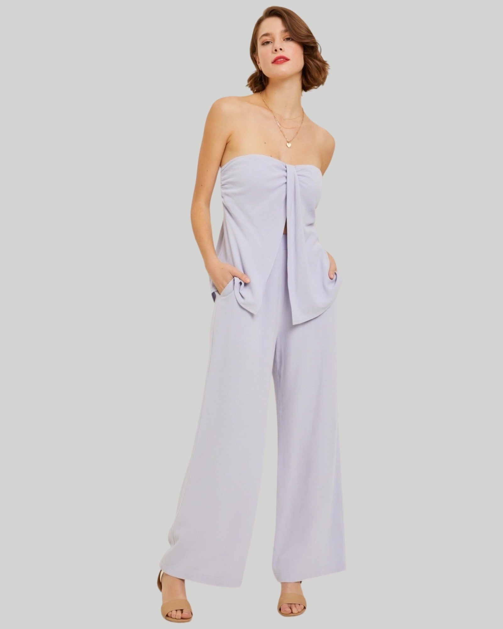 CLASSIC LINEN SET WITH TUBE TOP AND PANTS. FRONT FOLD OVER WITH OPEN SPLIT FRONT. FLARE PANT, ZIPPER FRONT SIDE SLIT POCKETS. Beautiful Lilac Color.