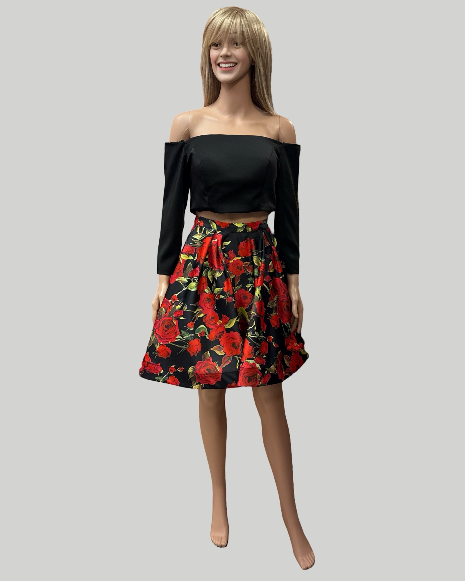 JVN B Jovani 2 Piece black top with black/red full skirt. Fun and Fabulous. JVN by Jovani 2 Piece. High Low Full, High Waist Skirt. Top Can be Worn Off the Shoulder with the Elastic Straps, Or Tuck Them in For a Bare Shoulder. Stunning.