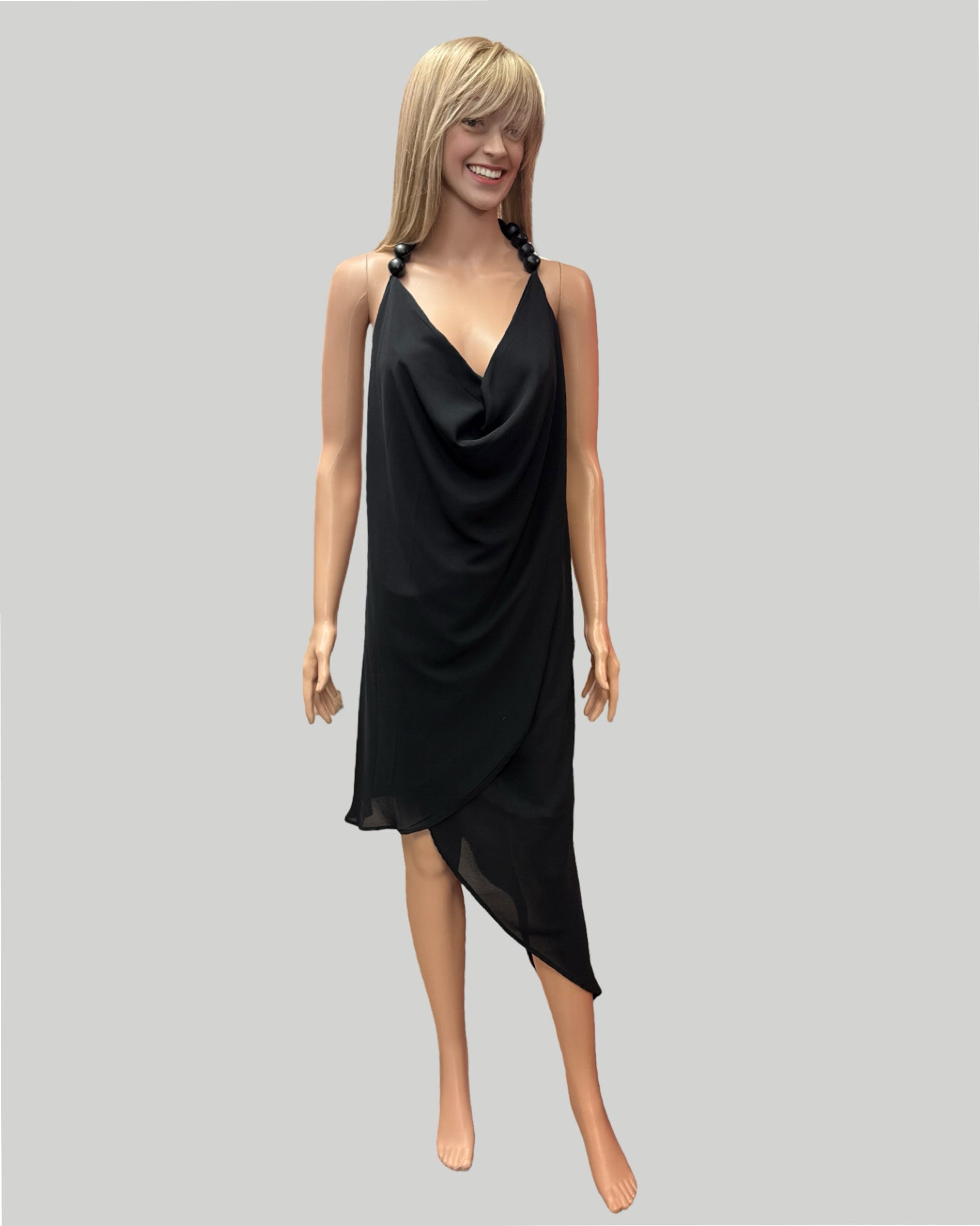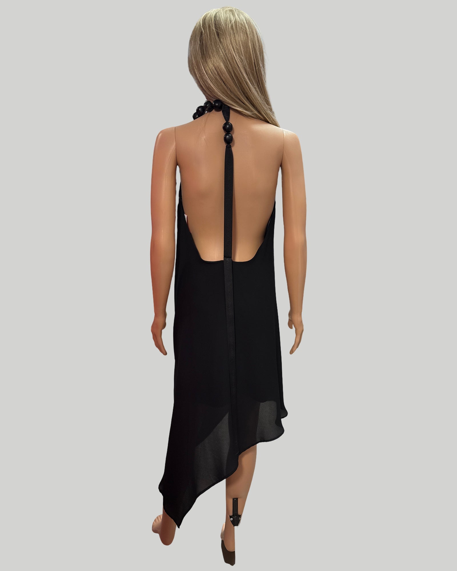 Gorgeous La Haine Black Dress. The Halter Neck is adorned with Black Round Beads. The Low Plunge Neckline has a Snap, for More Coverage. The back has a Button T Strap. Unique and Fabulous.