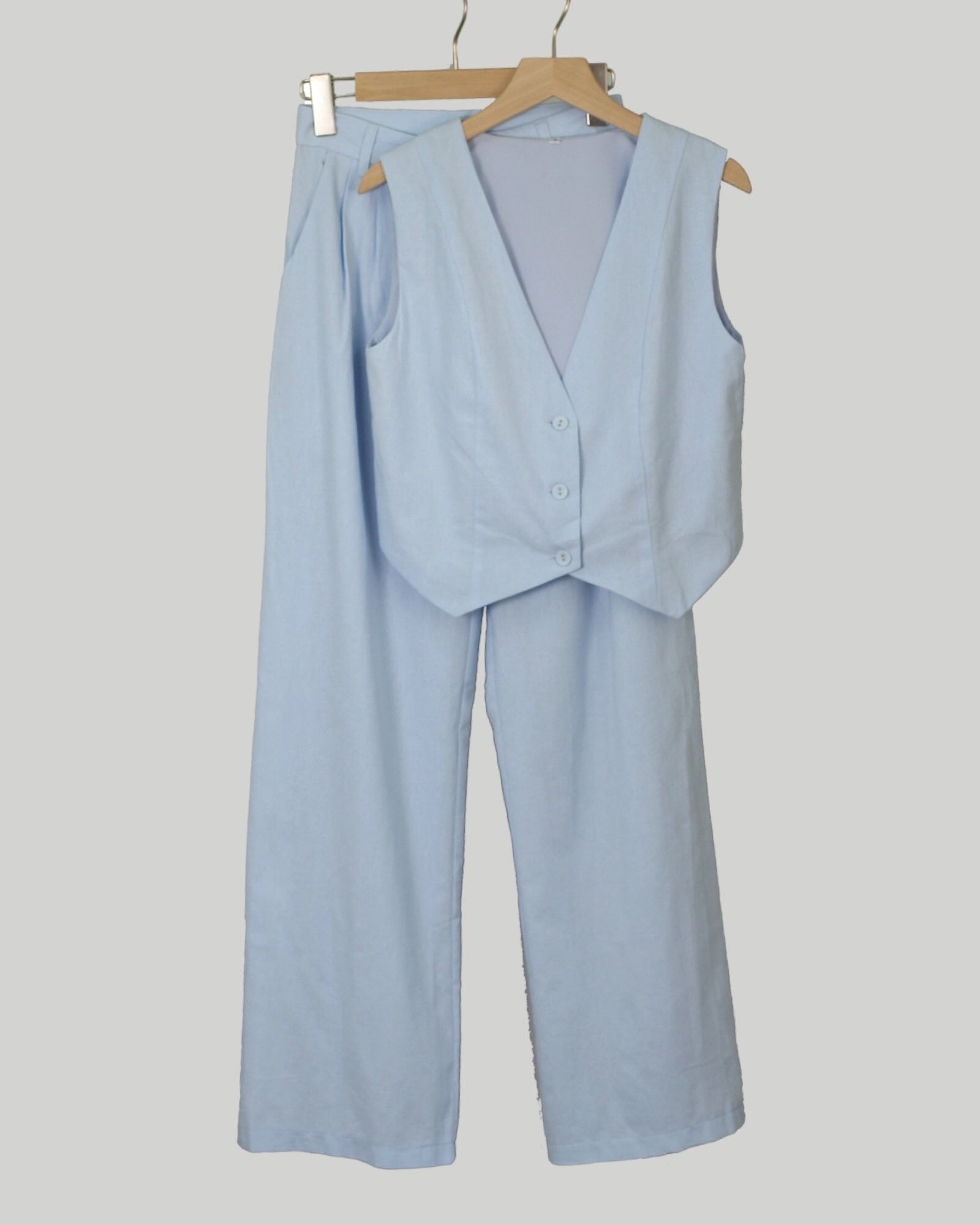 LINEN BLEND VEST AND PANT SET. Chic and stylish. V-Neck, Sleeveless, Button Front Vest with Button Front, Side Pockets, Lined Wide Leg Pants. Zipper and Hook Closure. Adorable and So Versatile. Wear it with a Tank or Tee, or Alone. Seperate the Two Pieces, and Wear the Vest with Jeans, Shorts or Linen Pants. Wear the Pants with a Tank, Tee or Sweater. Fabulous Outfit!