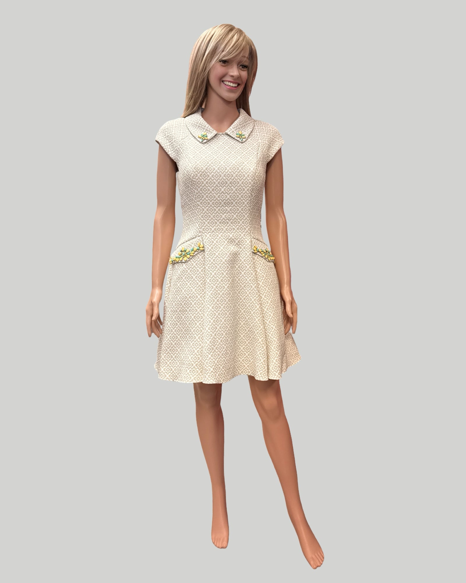 Mac Duggal Beige Day to Evening Dress. This Elegant and Sophisticated Dress Can Take You From Day to Evening. Collar and Pockets are Adorned with Green and Yellow Stones. The Skirt is a Full Flare Style, Flattering on All.
