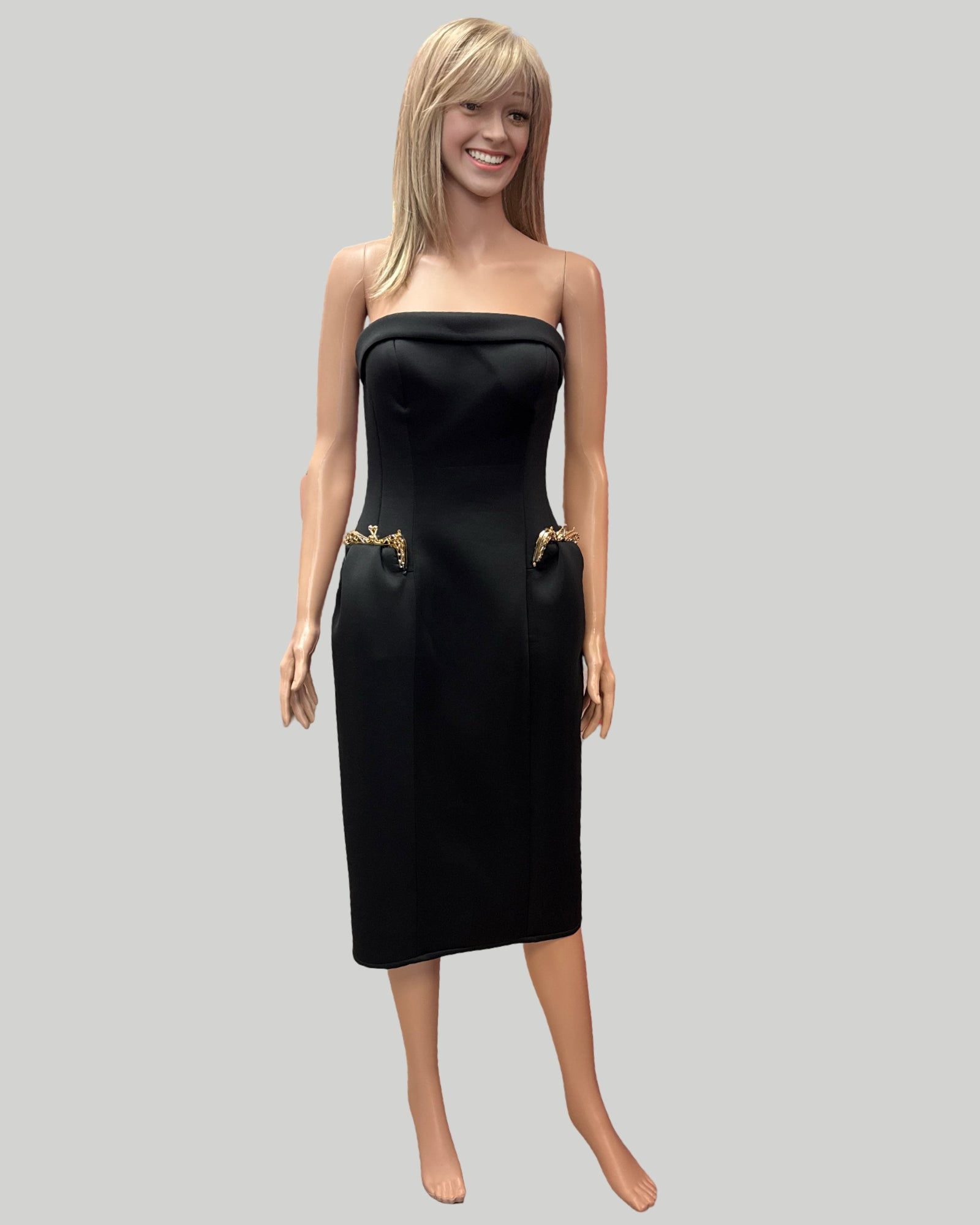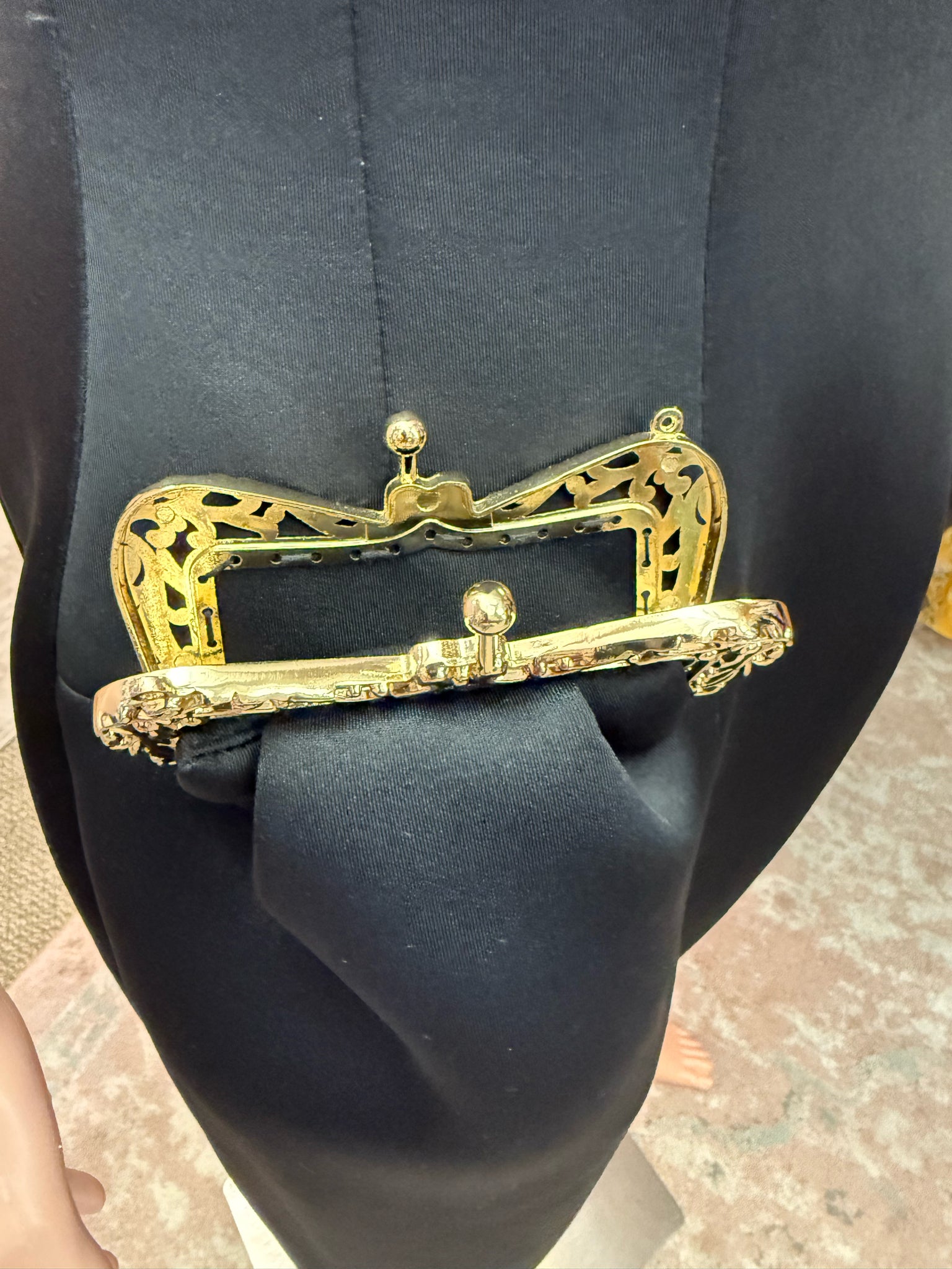 Mac Duggal black strapless dress with front "purse pockets". Gorgeous Midi Dress by Mac Duggal. Front Kiss Lock Purse Pockets. Back Zipper. Elegant and Sophisticated is an Understatement.