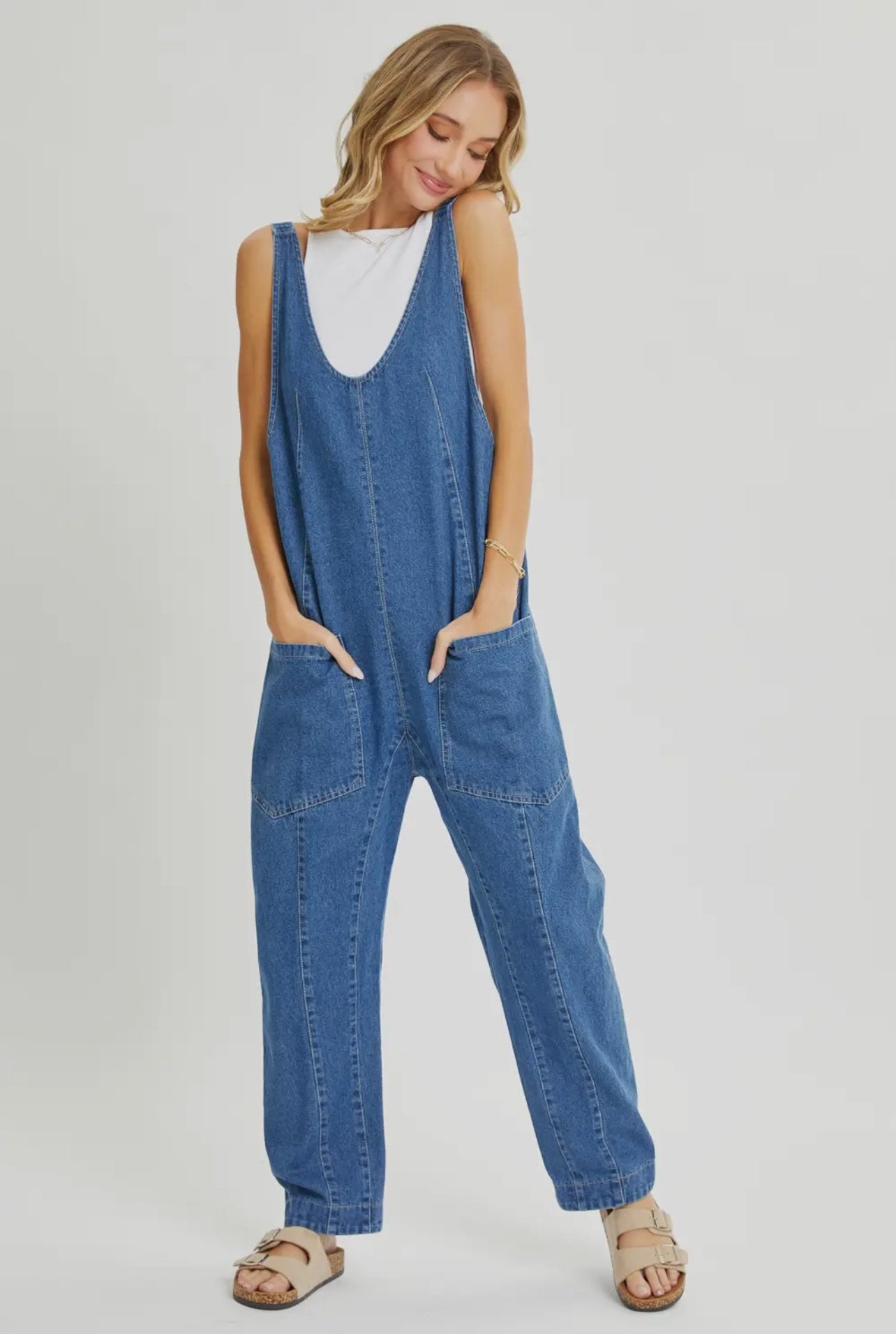 Easy denim jumpsuit. Slouchy relaxed pull-on-style. Oversized patch pockets, drop-crotch harem style legs. Adjustable shoulder straps easy everyday wear with your favorite graphic tee and sneakers for a casual day look. 100% Cotton