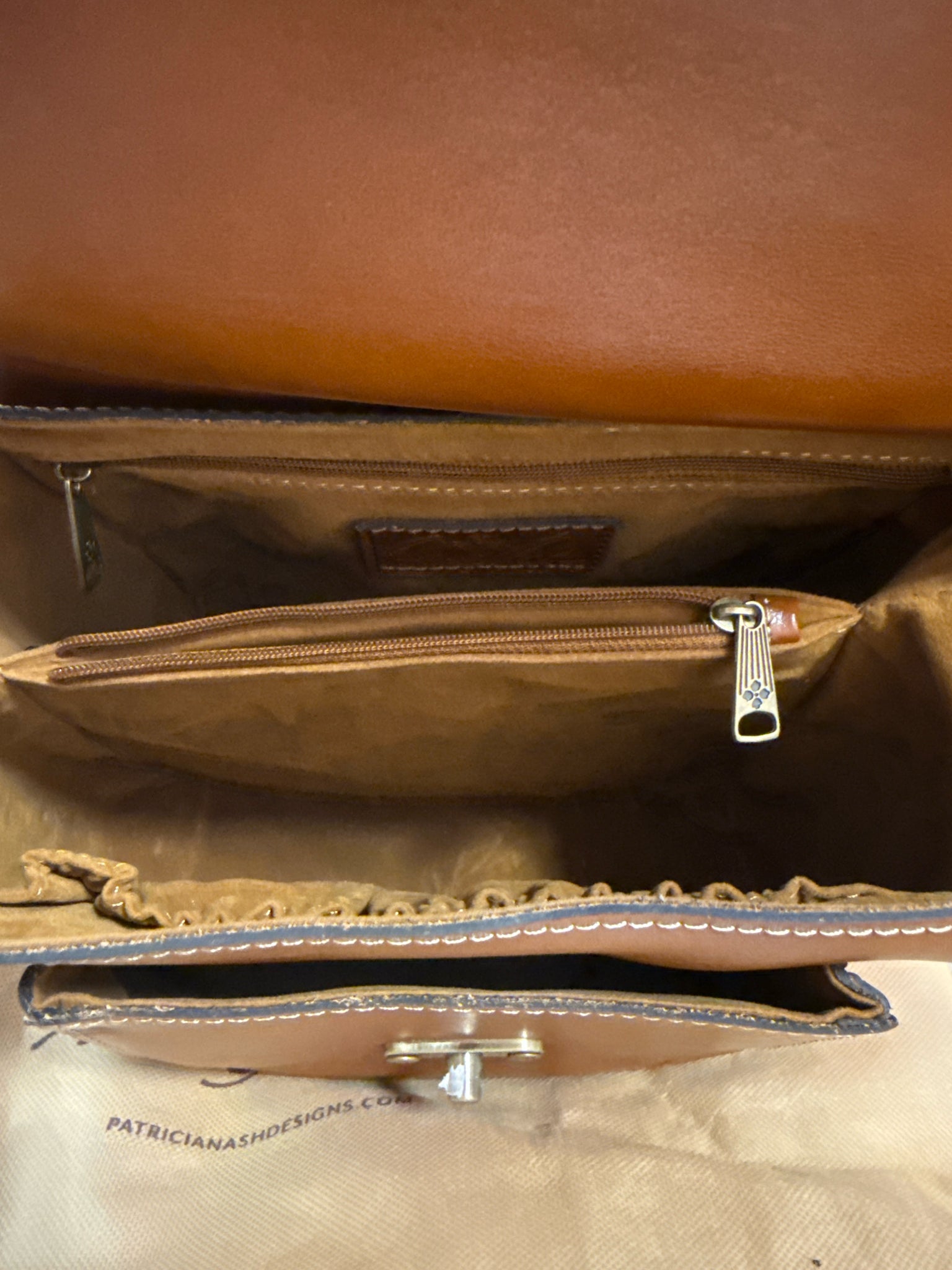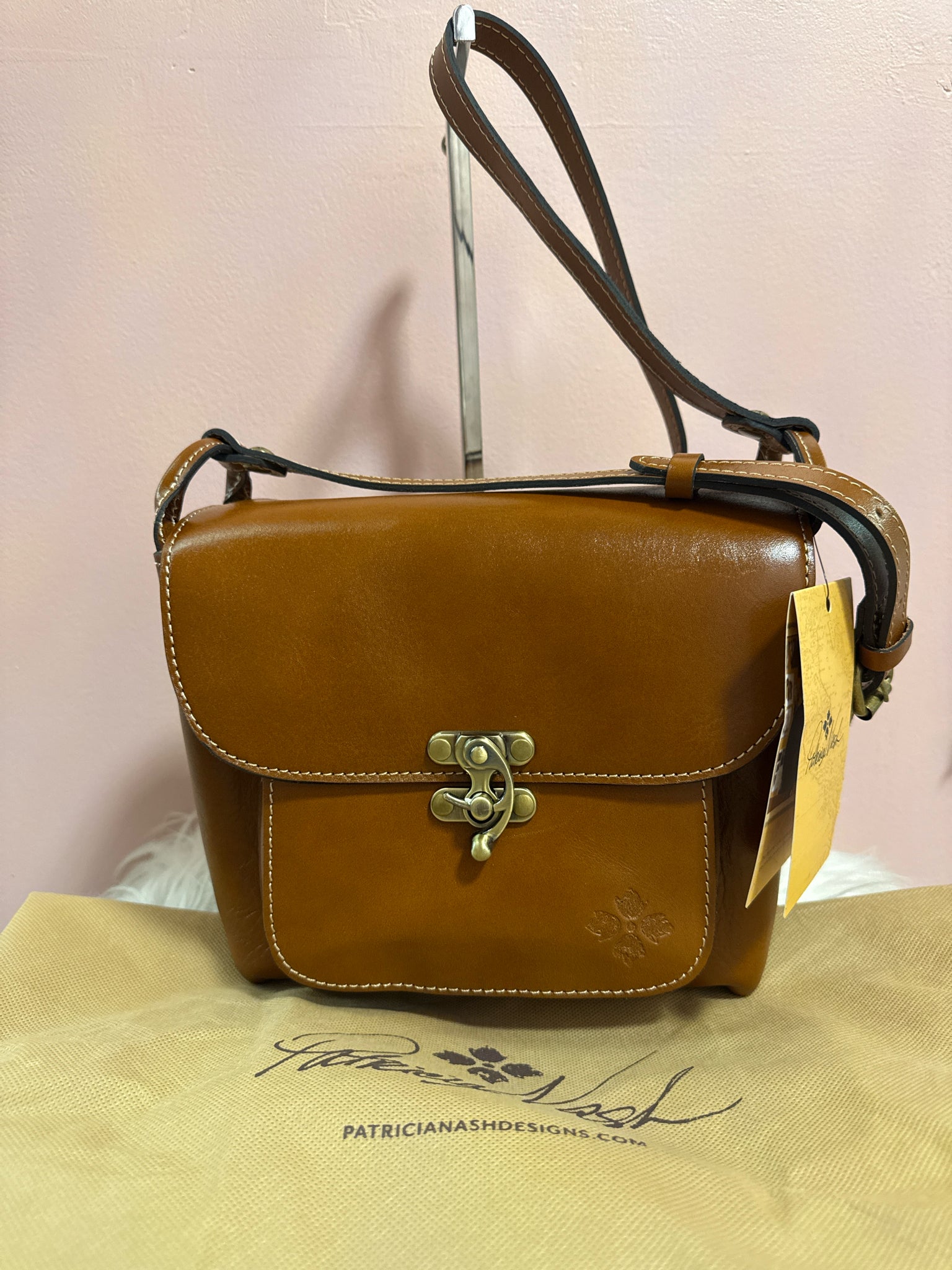 Patricia Nash Leandra flap shoulder/cross body bag NWT. Beautiful Tan Leather Patricia Nash bag. Gold tone Hardware Closure. Pristine Condition, NWT. Dust Bag Included.