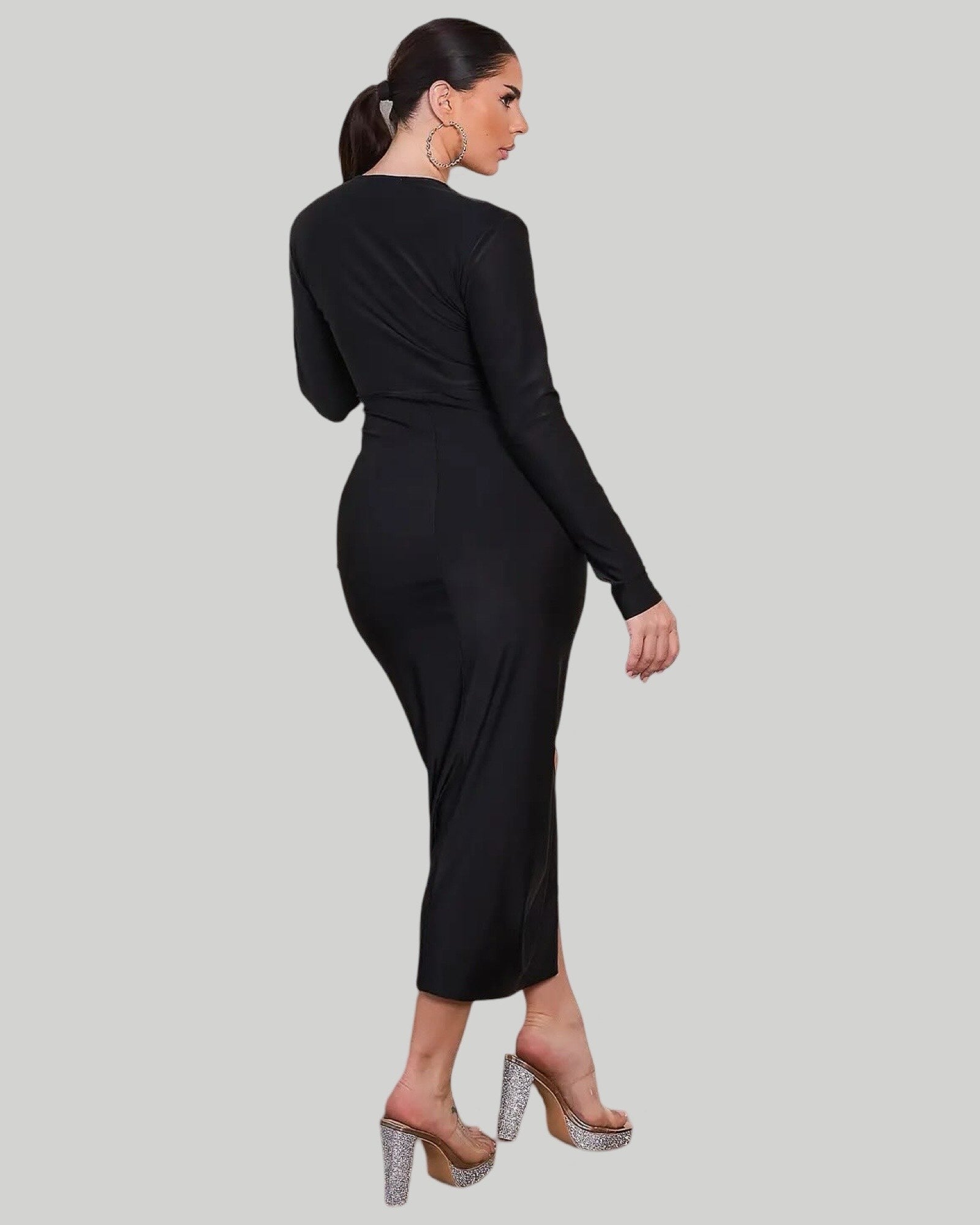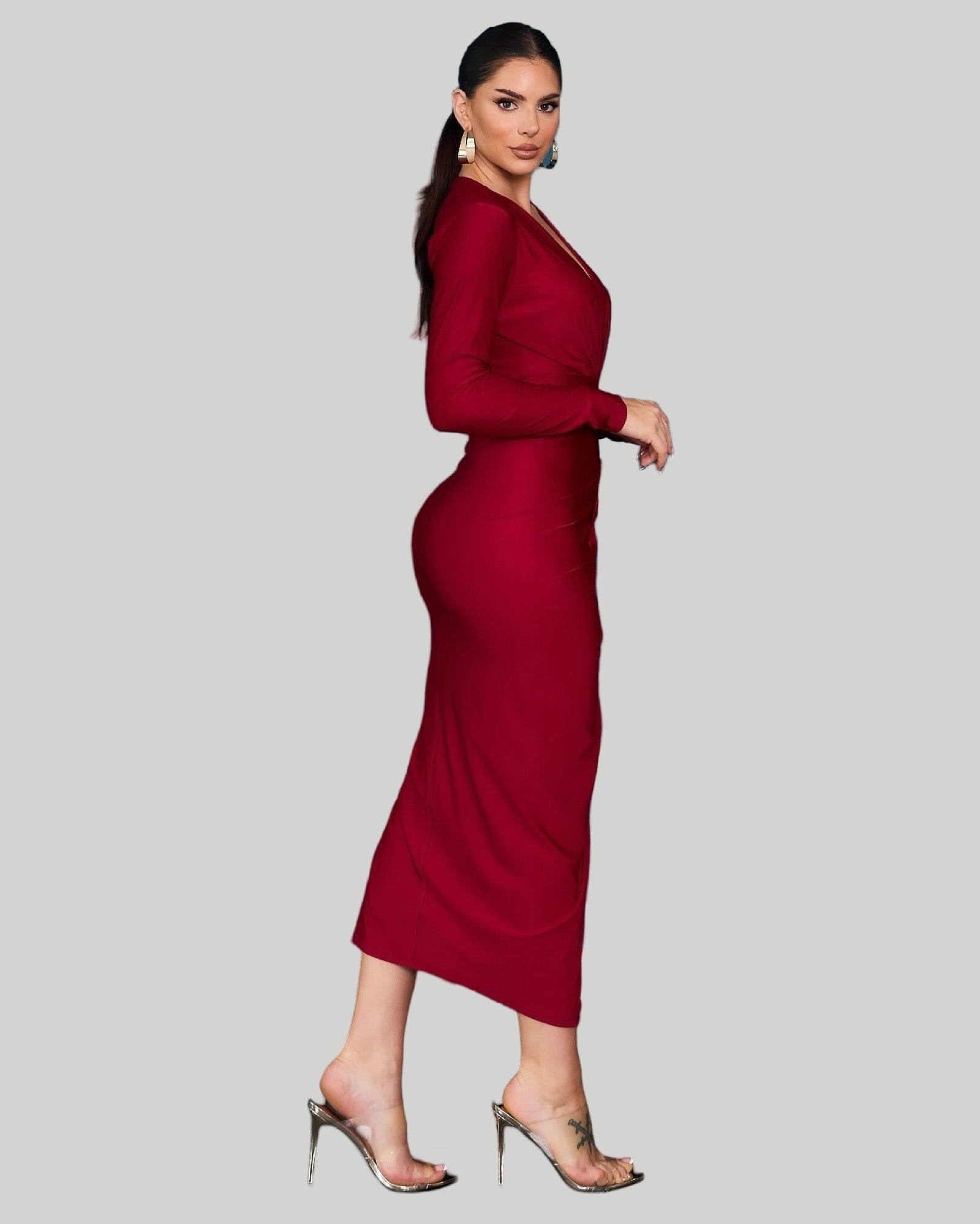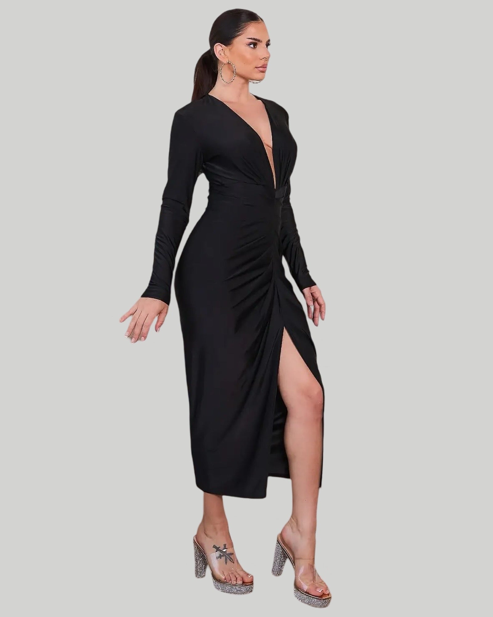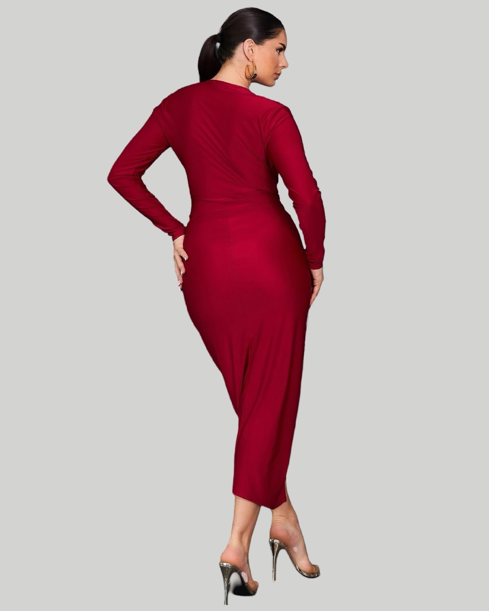 SOLID LONG SLEEVE DEEP V MIDI DRESS.Plunge neck with long sleeve midi length dress