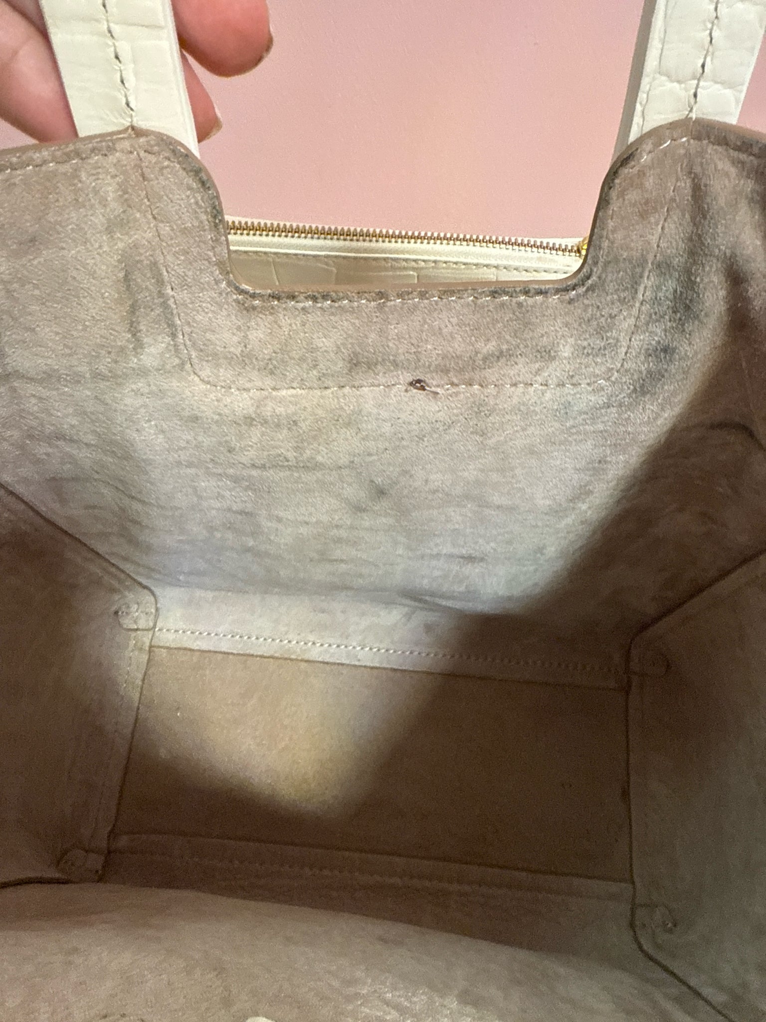Staud embossed leather top handle bag . Tan Embossed Leather, Flat Beige Handles. Interior has Suede Lining with a Beige Zip Pouch. Handle Drop: 3.5" Height 9.5" Width 10.25" Depth 5" Pre-loved Marks on the Handles, and Minor residue on the Interior
