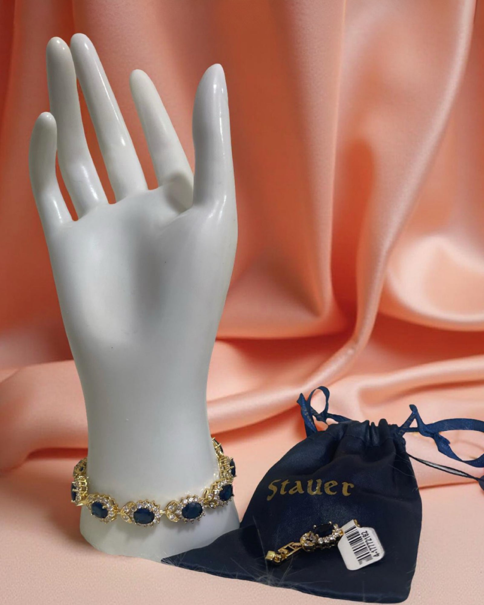 STAUER AZURE SKIES BRACELET WITH Separately BAG BRASS W YELLOW GOLD FINISH ALTERNATIVE DIAMOND AURA. 7.5" + 1" EXTENDER. Beautiful "Pre-Loved" Bracelet, Pair with Matching Earrings, Sold Seperately.