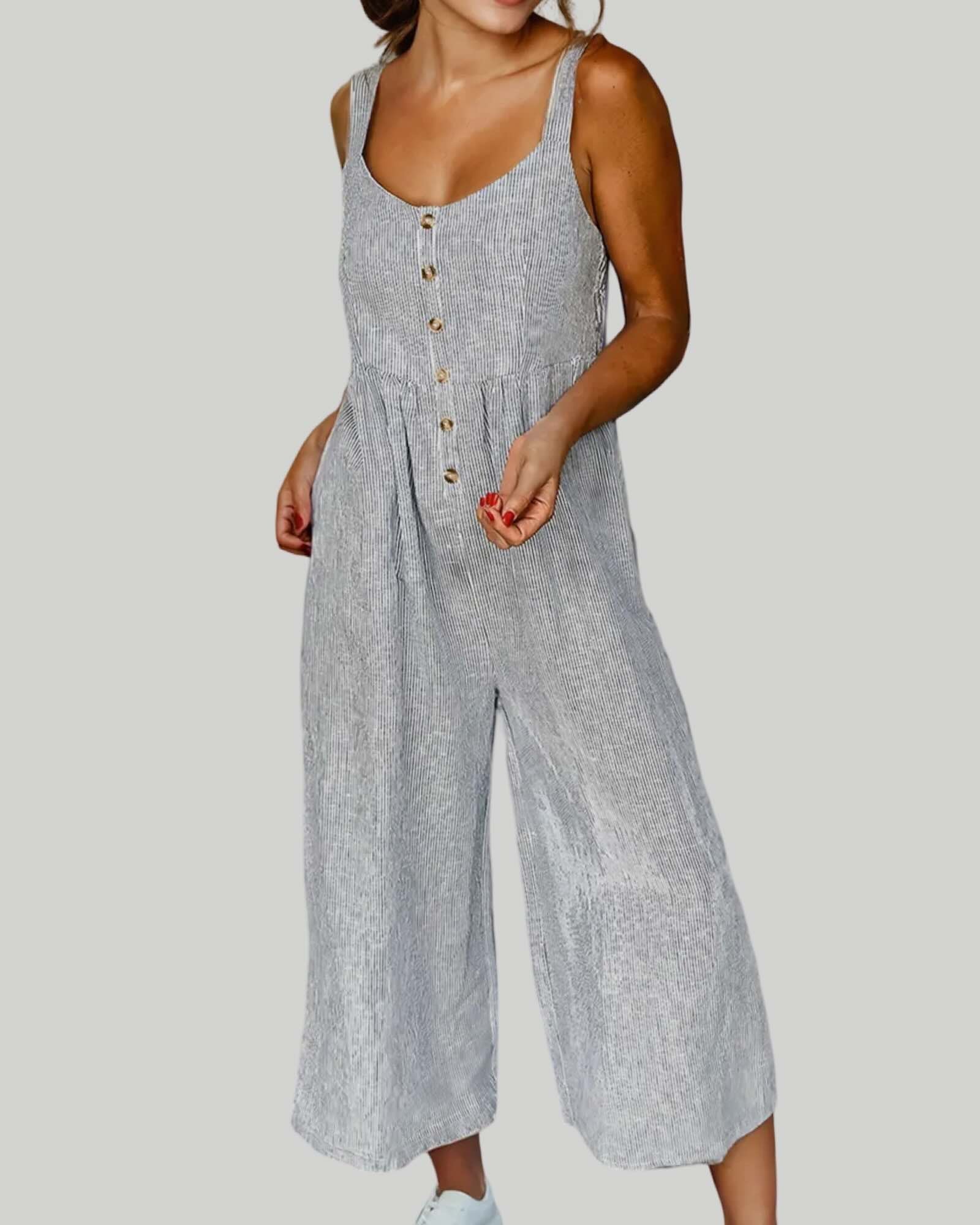 STRIPE HALF BUTTONED SLEEVELESS WIDE LEG JUMPSUIT. Elevate your wardrobe with this chic, meticulously designed piece that seamlessly blends style and comfort. Pair with a tank, tee or alone. Adorable Summer Jumpsuit. Material: 65% Polyester / 35% Cotton