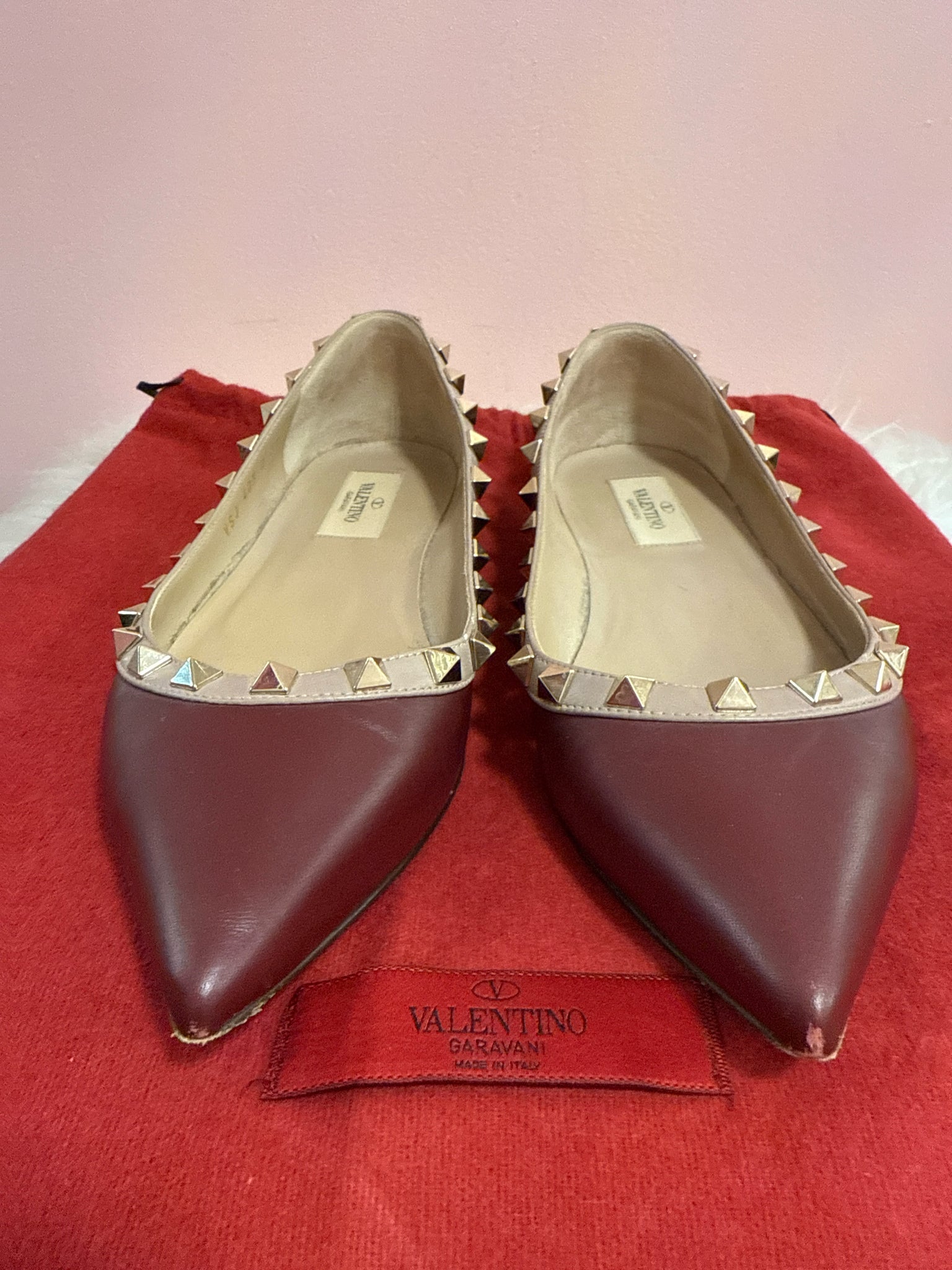 Valentino Garavani Rockstud Pointed -Toe Ballet Flats with Dust Bag. Beautiful burgundy leather with beige trim and platinum-finish studs.