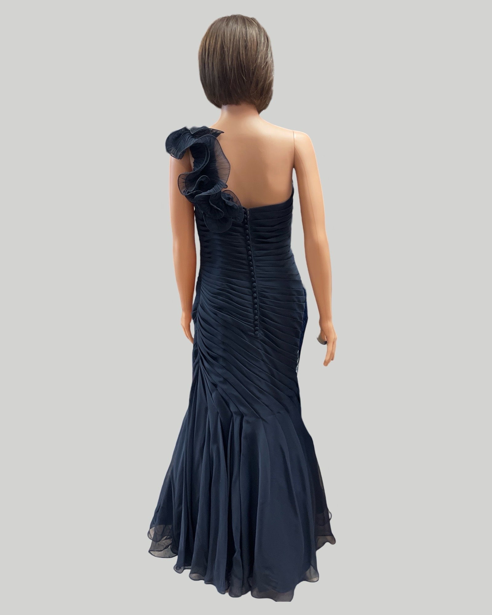 VM Sophistication NAVY RUFFLE GATHERED DETAIL MATCHING SHAWL SIZE 8. BLACK GARMENT BAG. Gorgeous MOB or MOG Gown. Grace, Sophisticated and Elegant is What This Gown is All About. The Back Has a Full Hidden Zipper With Covered Buttons.