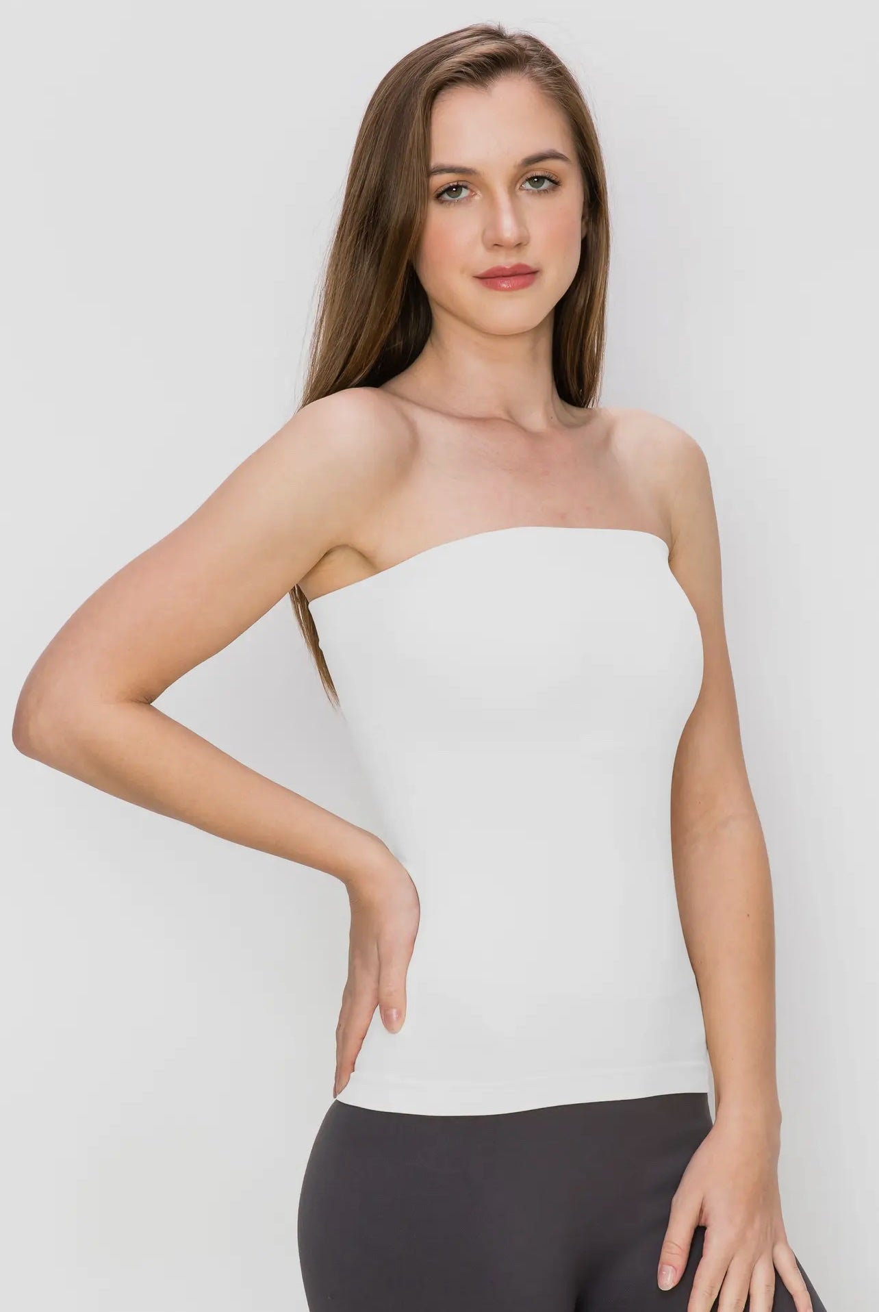 WHITE MEDIUM LENGTH TUBE TOP WITH BUILT IN SHELF BRA
