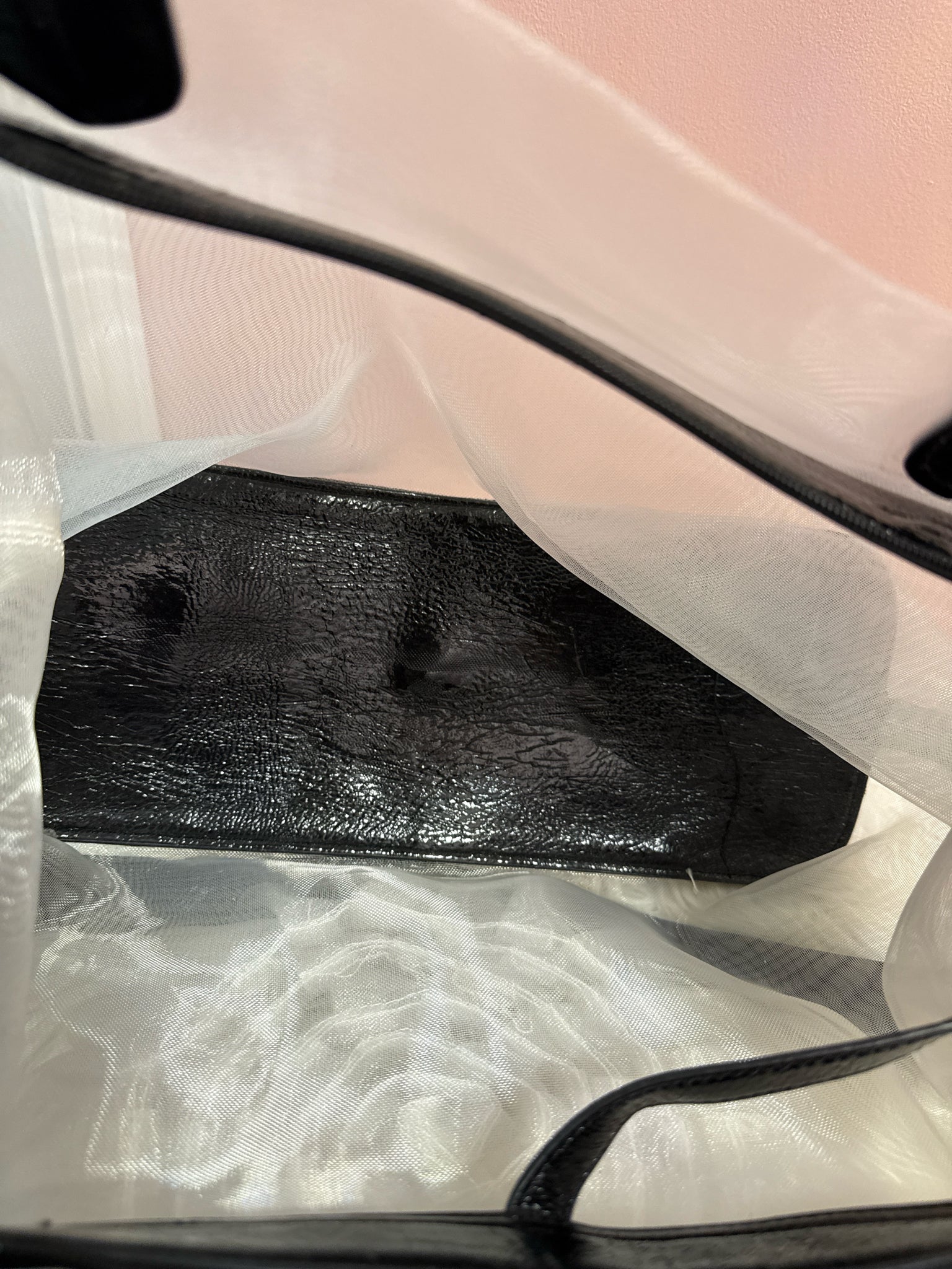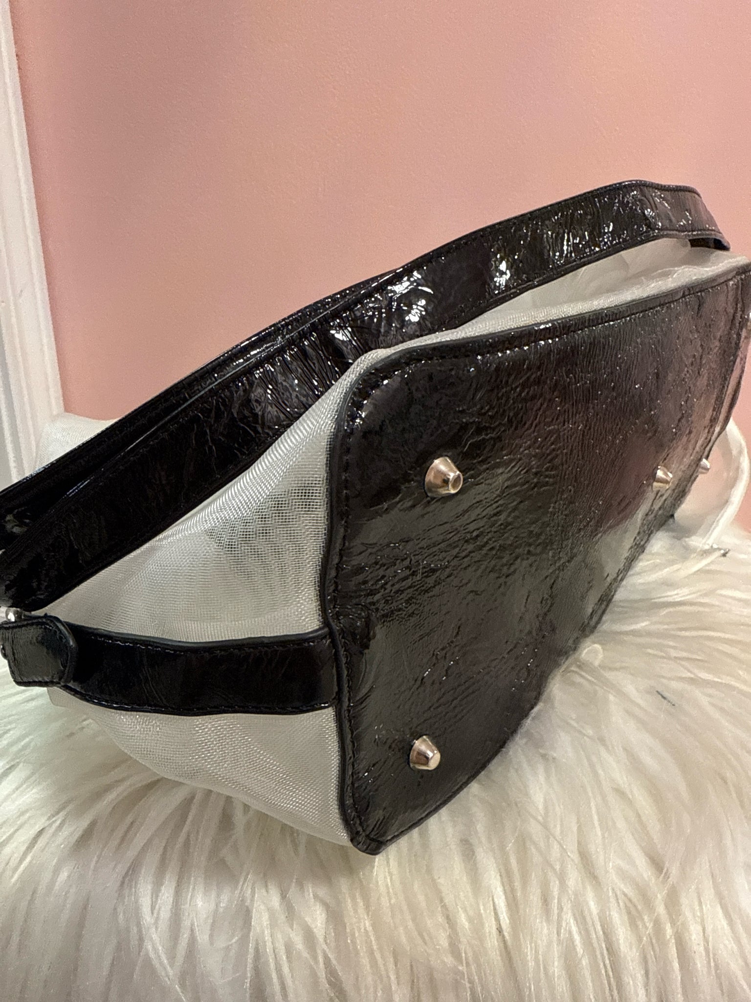 White mesh flower shoulder/handbag. Detachable shoulder strap. Large flower adorns the front, black straps, white mesh cosmetic case included.